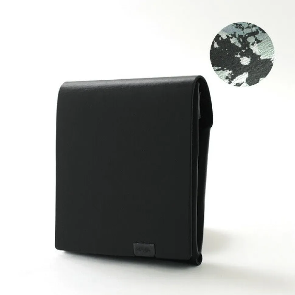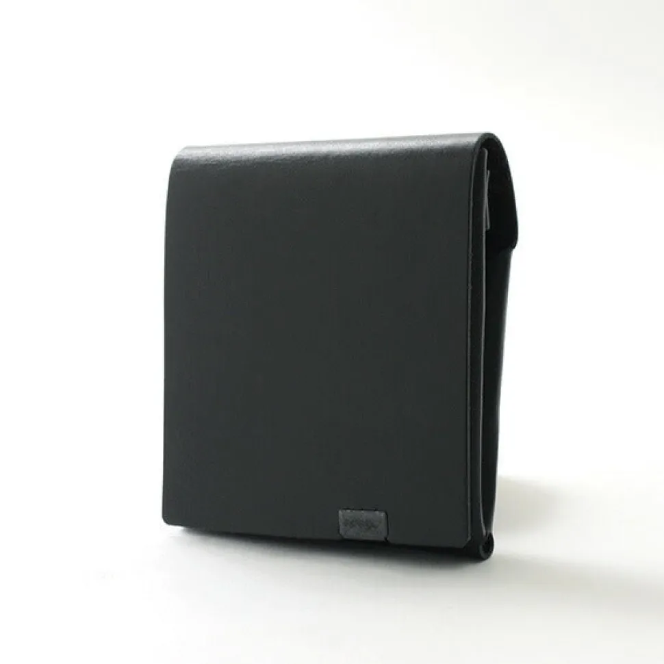 This minimalist folded wallet is formed by folding a single piece of leather without sewing and fastening it at a single point. The compact size allows it to fit in a pocket, making it easy to use.