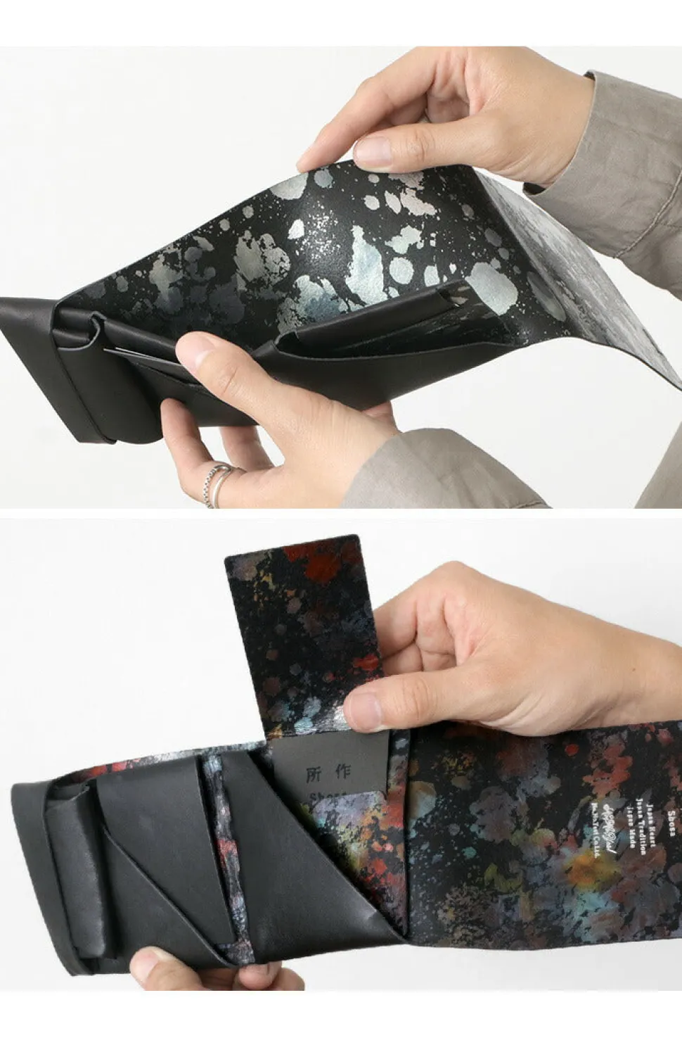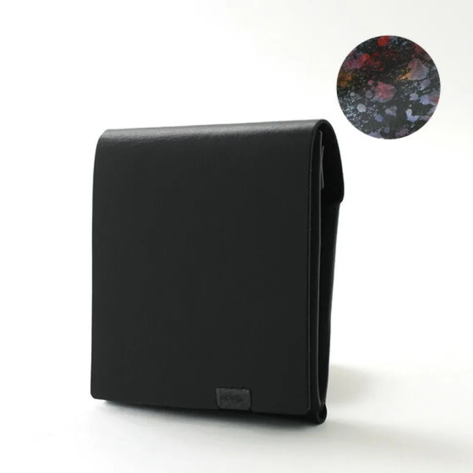 The clean appearance of the cover, which wraps around the wallet, reveals a foil-stamped pattern inside when the wallet is opened. It has a gorgeous yet elegant look that can be enjoyed by both men and women. Each piece has a different expression with vivid colors that look as if they have been painted. The artistic quality is one of the charms of this product.