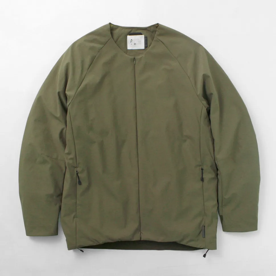 Introducing a down blouson featuring a clean and minimalistic look by minimizing stitching.