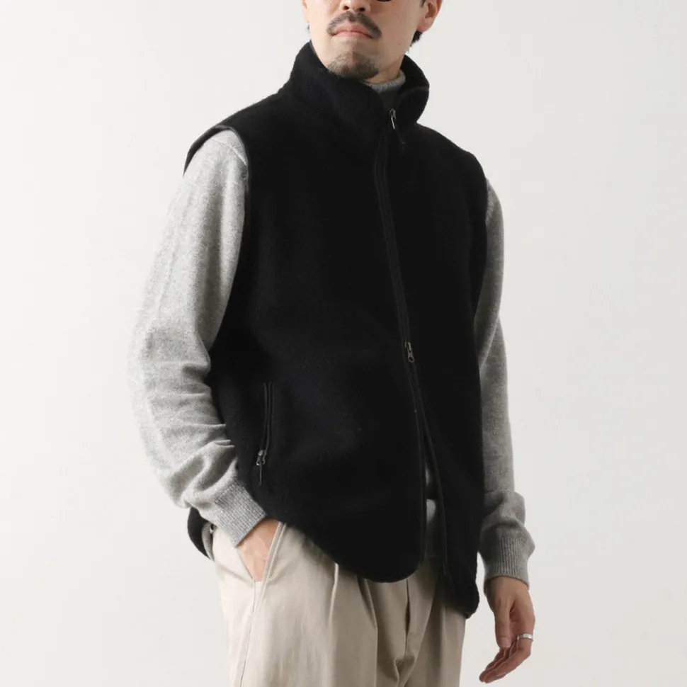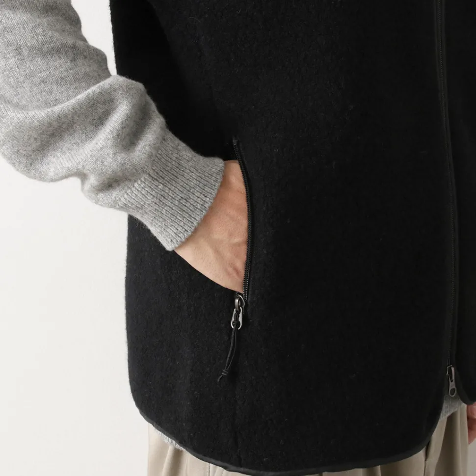 This is an introduction to a zip-up vest made from “Techno Wool”, a functional material made by the Italian fabric manufacturer Pontetorto.