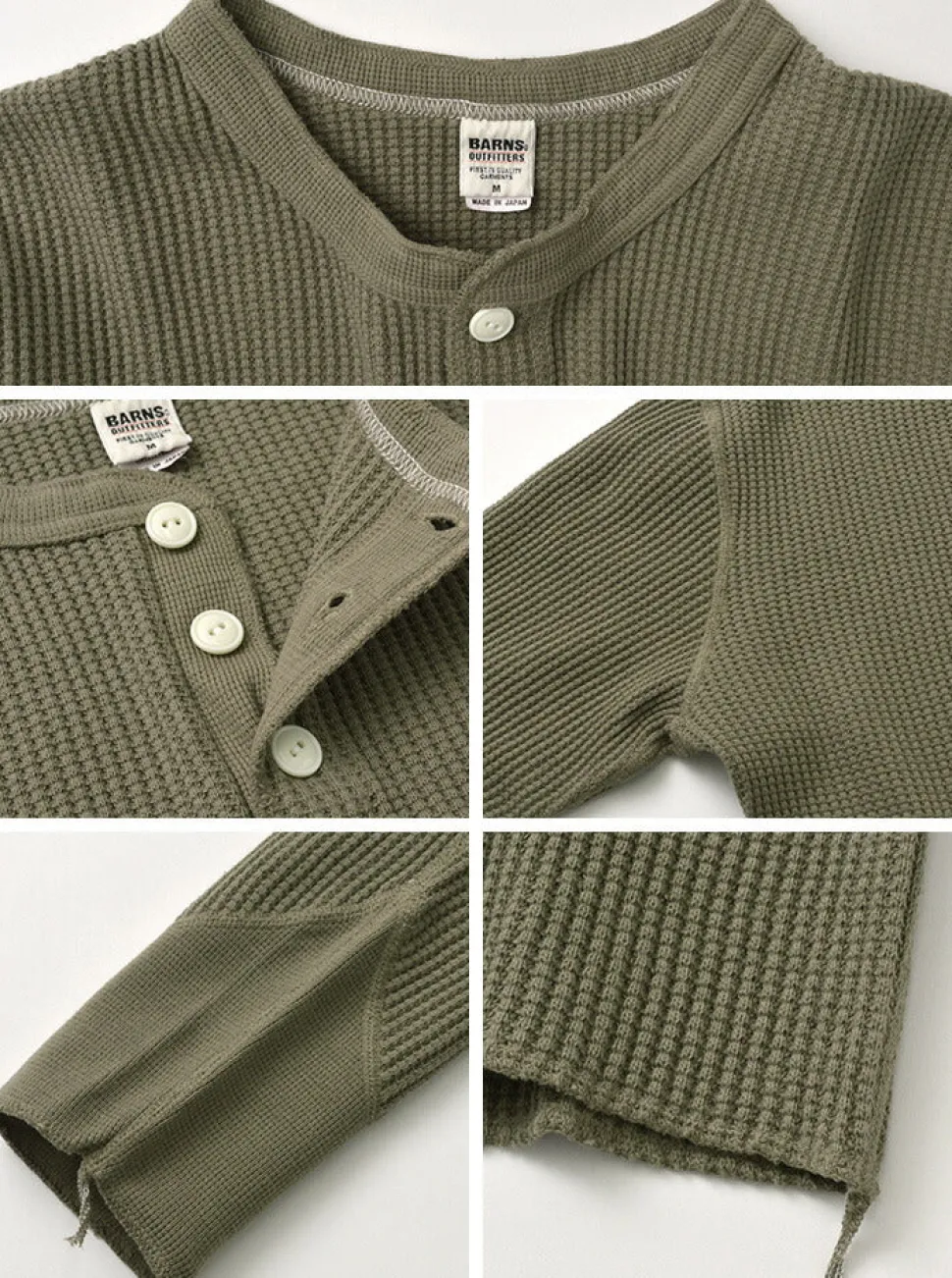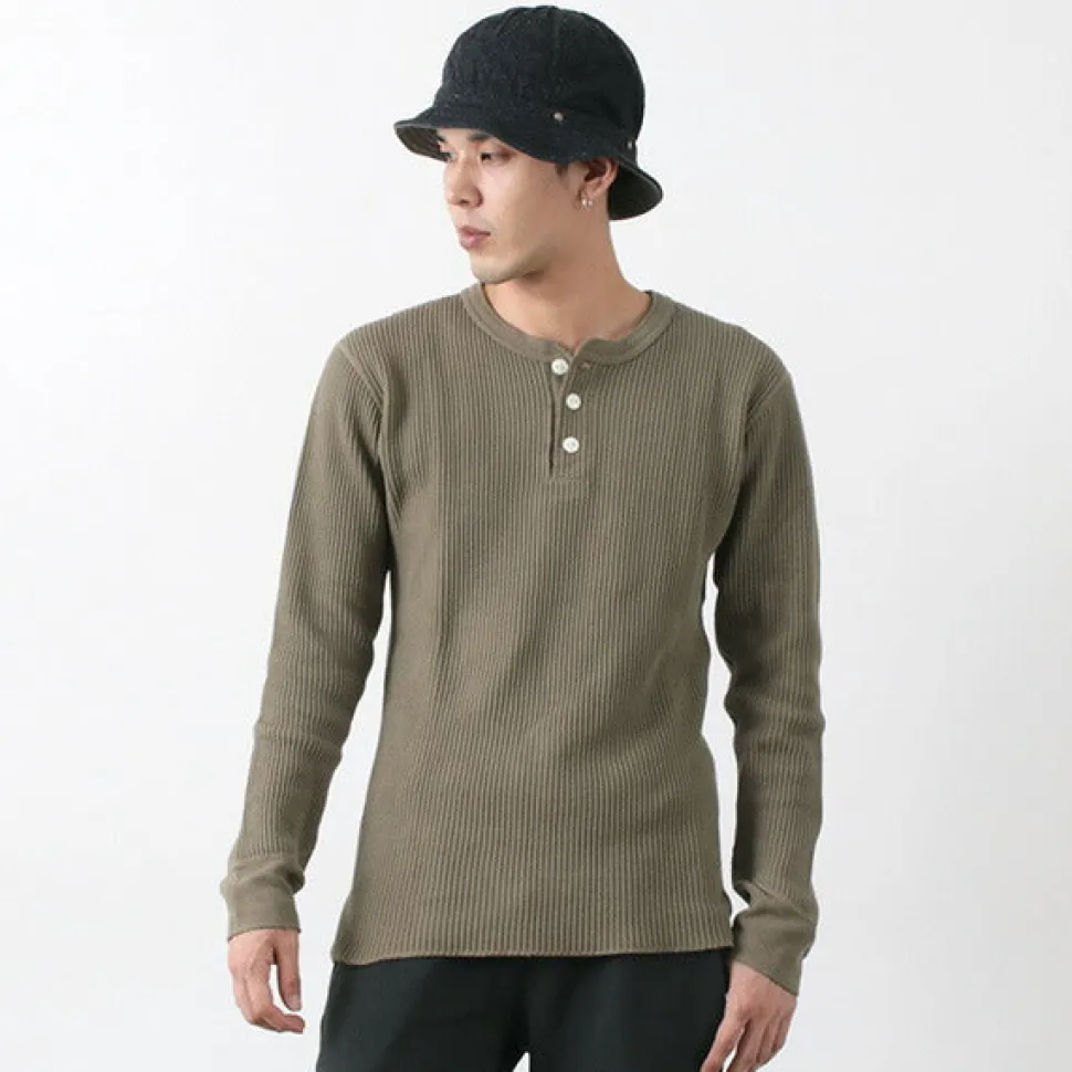 Thermal TeeBARNS Henley Neck T-Shirt is made from our classic Big Waffle fabric. It is originally a thermal with a strong connotation of underwear, but this item can be enjoyed simply as a single piece due to the thick fabric and detailing. Of course, it is also comfortable to wear as an inner layer, because it is also excellent for keeping out the cold. Also available in ROCOCO special order colours! The trendy and calm khaki colour is an original colour specially ordered by ROCOCO. The khaki colour is a trendy and subdued color, which is available only here.