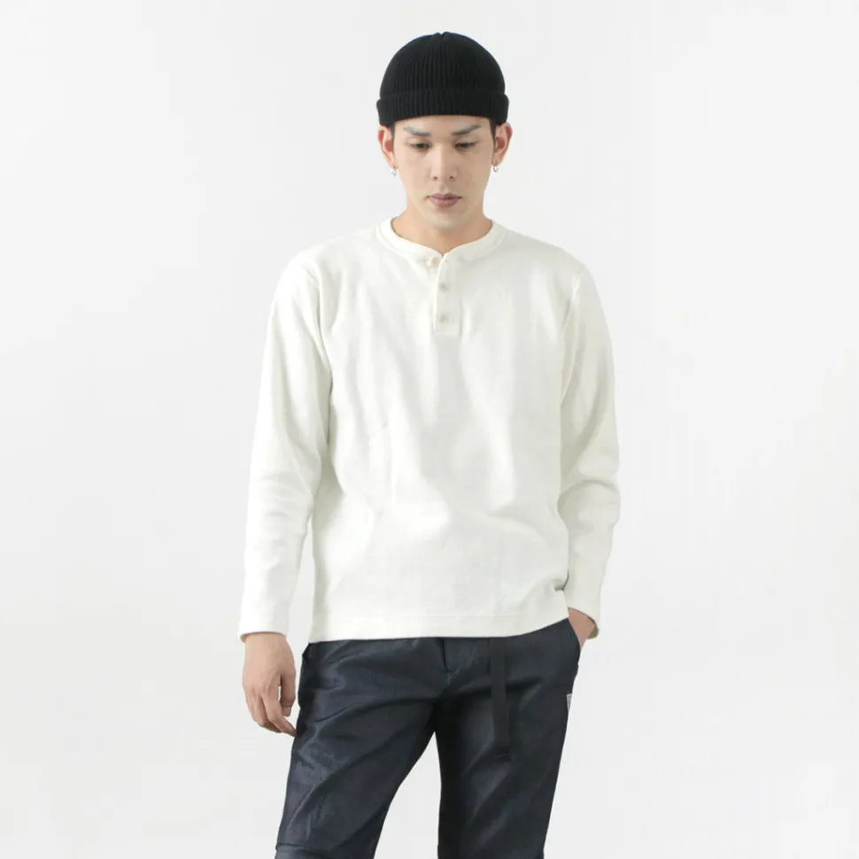 All-around henley-neck T. This henley-neck T-shirt is made of Barnes’ heavy spun milling fabric, specially ordered by ROCOCO. The design is made with attention to detail and the stretchiness and fit unique to spun milling fabric are combined to create an all-around great finish. You can wear it as you like, with the front placket zipped open for a relaxed look or tightly closed for a classy look, which will greatly expand your coordination. Unusually thick spun milling fabricThe heavyweight fabric, which is rare in spun milling fabrics, is made of No. 20 single yarn, and has a fit that wraps around the body. Spun milling fabric is a knit fabric with elastic knitting and features excellent elasticity and moisture absorbency. Polyurethane is blended into the fabric to add kickback properties, making it a durable fabric that is hard to damage even when washed with a lot of gunpowder.