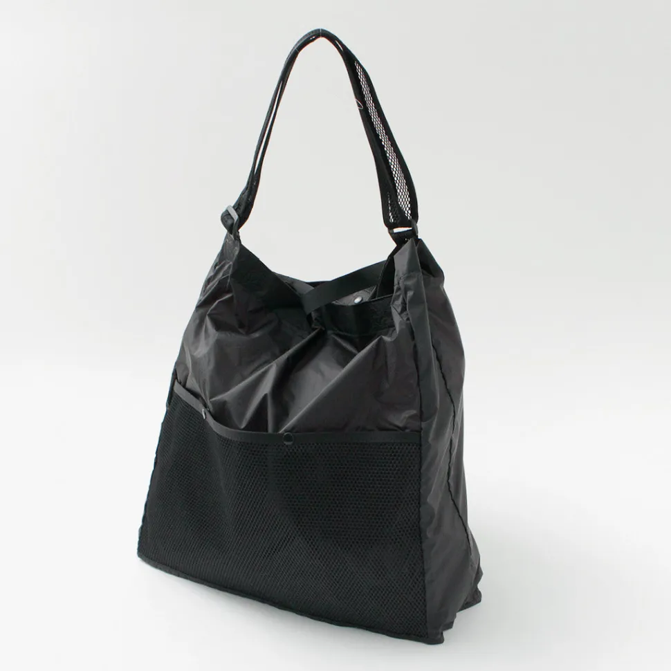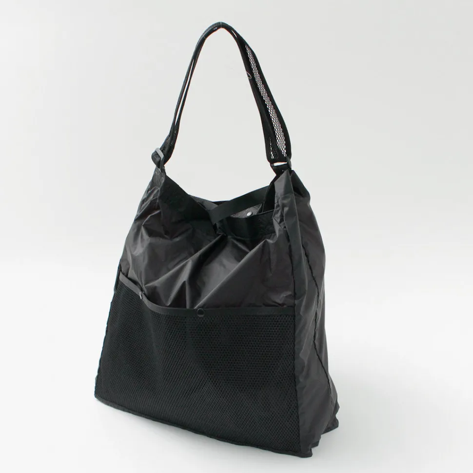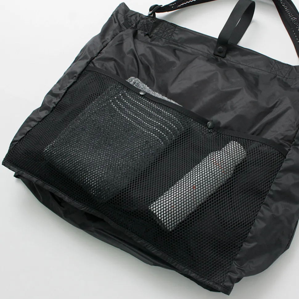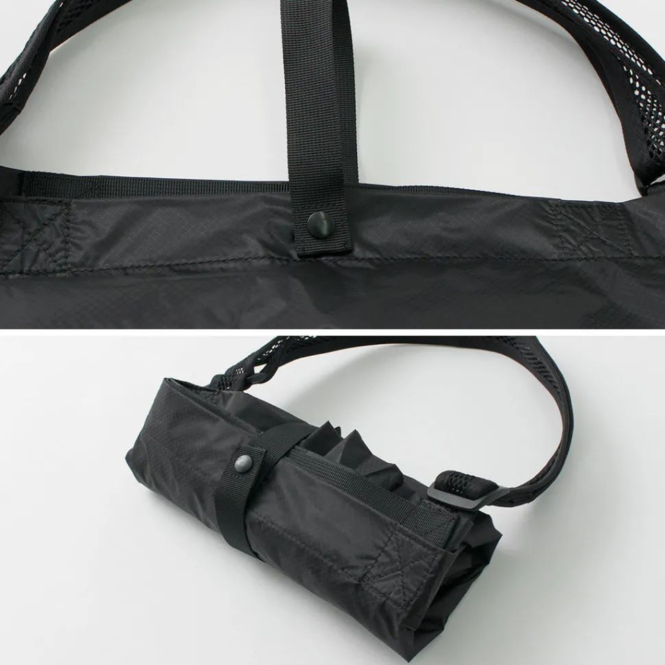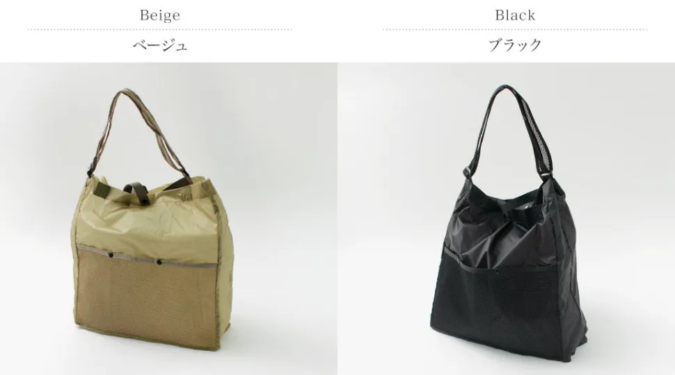 BURLAP OUTFITTER introduces a shoulder tote bag composed of lightweight, water-repellent Cordura sil nylon and mesh material. This item focuses on the fact that it is lightweight and foldable anyway. Despite being a minimalist item, it has a large capacity of approximately 31 liters and can be used not only as a bag for holidays, but also as a sub-bag if you keep it in your regular main bag.