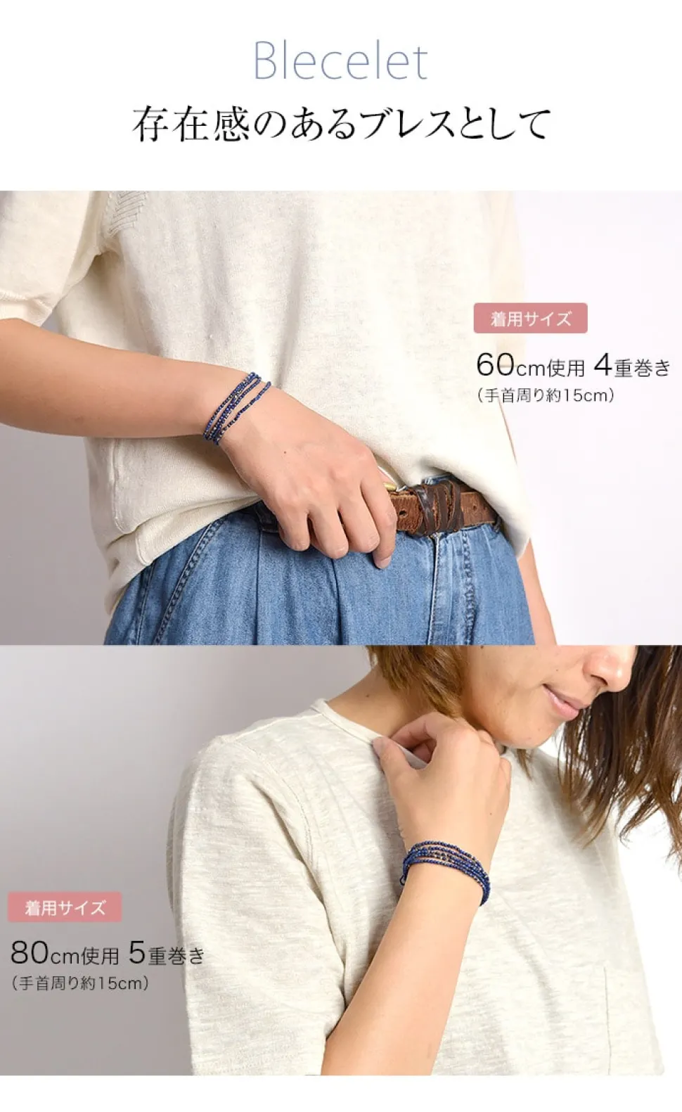 The 60cm can be worn “4 wraps” and the 80cm “5 wraps”. Wrap it up to create a voluminous accessory.