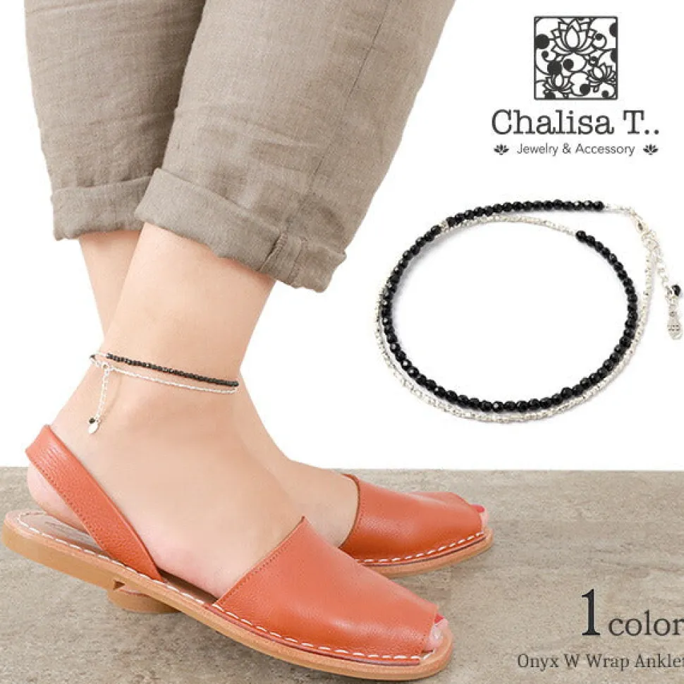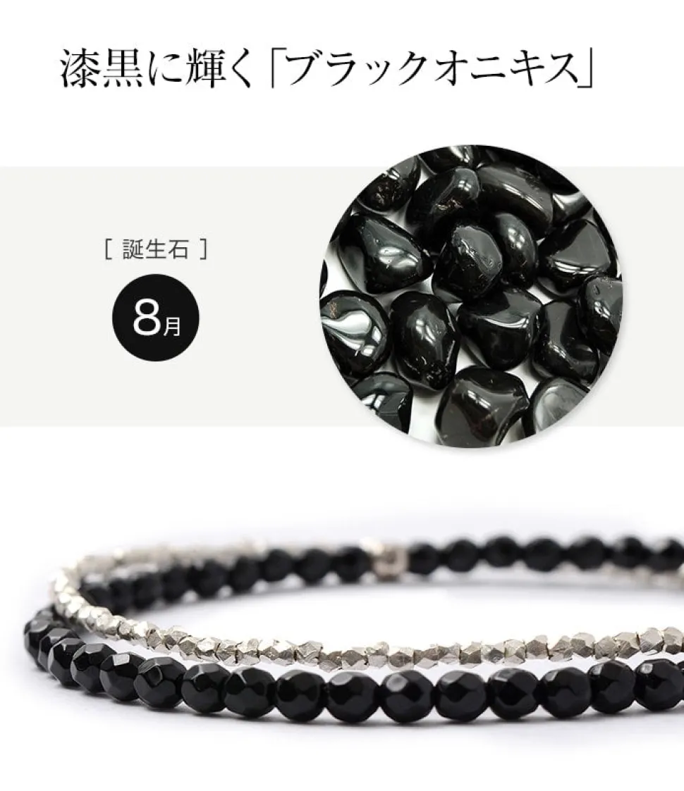 Onyx and Karen Silver W-Wrap AnkletThis W-wrap anklet combines the beautiful black, luxurious onyx cut beads with warm Karen silver. The two types of beads are well-balanced and create a sense of sophistication. The two types of beads are well-balanced and create a sense of sophistication, and the Karen silver incorporated between the onyx beads is an accent. Onyx is very popular in Japan because of its gentle presence that gives a sense of calm and security. Onyx has been valued since ancient times as a stone to ward off evil and bad spirits. Many people wear onyx as a stone that guides them to take steady actions to realize their goals.