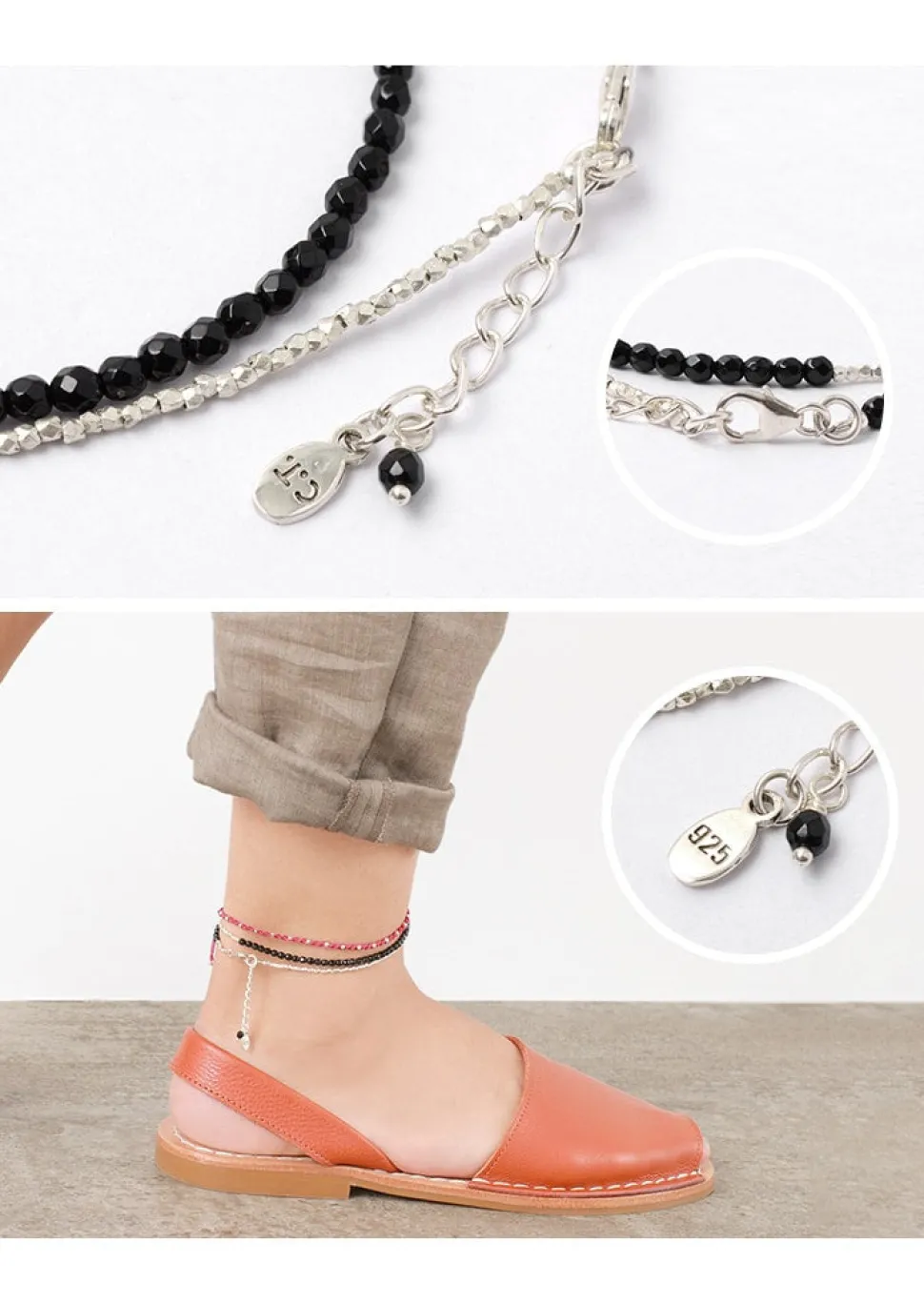 A cut onyx bead and a smaller Karen silver bead make up the two types of anklet. The onyx beads are cut in onyx and the smaller Karen silver beads are cut in onyx. The onyx is accentuated by a single Karen silver bead embedded between the onyx beads.