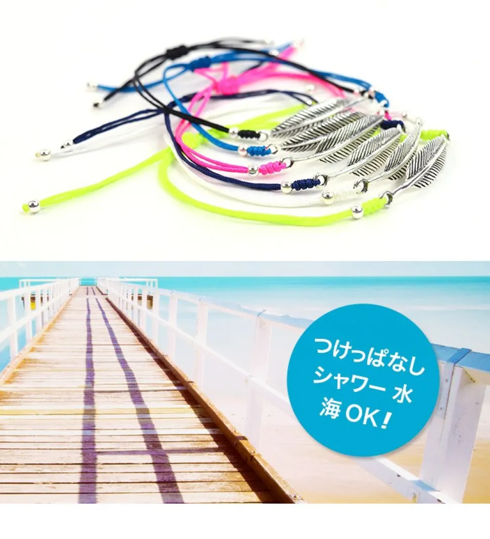 Notched cord bracelet with impressive feather charmThe notched cord bracelet features a rich color variation and a feather charm. The combination of the beautiful shine of 925 silver and the colorful notched cord will enhance your summer style. The bracelet is water-resistant and dries quickly after getting wet, so you can leave it on all day long, making it perfect for summer leisure activities. The beautiful brilliance of 925 silver 925 silver is one of the types of silver. The number 925 refers to the silver content (purity) of the alloy, which contains 92.5% silver. The fact that pure silver is now 925 does not diminish its beauty, but rather gives it a beautiful shine. Water-resistant notched cordsNotched cords are made of polyester yarn that has a silky sheen to it. Even a single thin cord is very strong, making it an ideal material for accessories. A wide range of color variations that can be combined to create a variety of looks. A simple single cord has a strong presence, but it can also be worn in layers depending on your mood, purpose, or location.