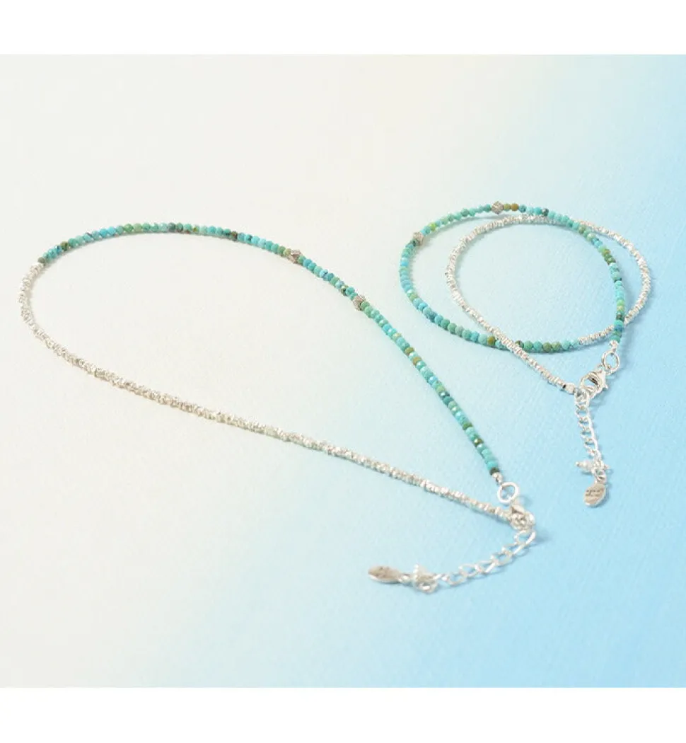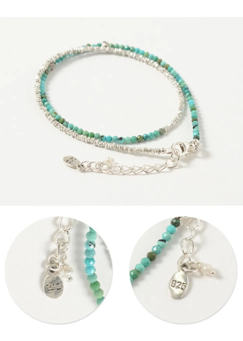 The bracelet is made of turquoise beads cut into small pieces and Karen silver, which has an attractive shine. The bracelet is small in size, but has a strong presence and will add a gorgeous touch to your hand. Vibrant Turquoise BeadsTurquoise, a natural stone, is made into multi-cut beads of approximately 1.5 to 2 mm. The deep green, bright blue and other colors that only natural stones can draw you in will look great on your bare skin. Each piece of Karen silver is finely cut and has an uneven size and shape. It has a matte finish, but with a unique luster that gives it an attractive shine depending on how the light hits it. The clasp is made of 925 silver and has a 3cm adjuster so you can adjust the size.