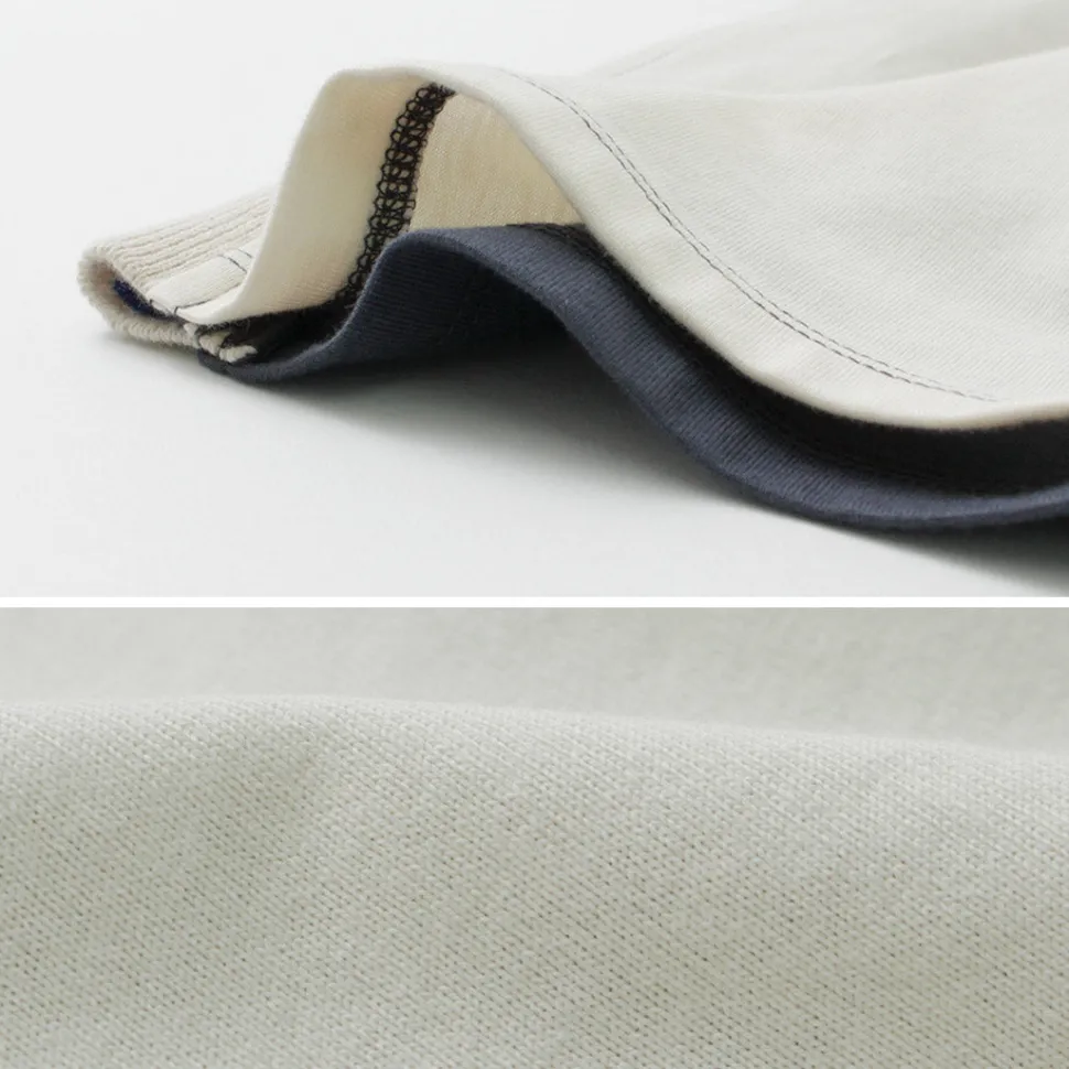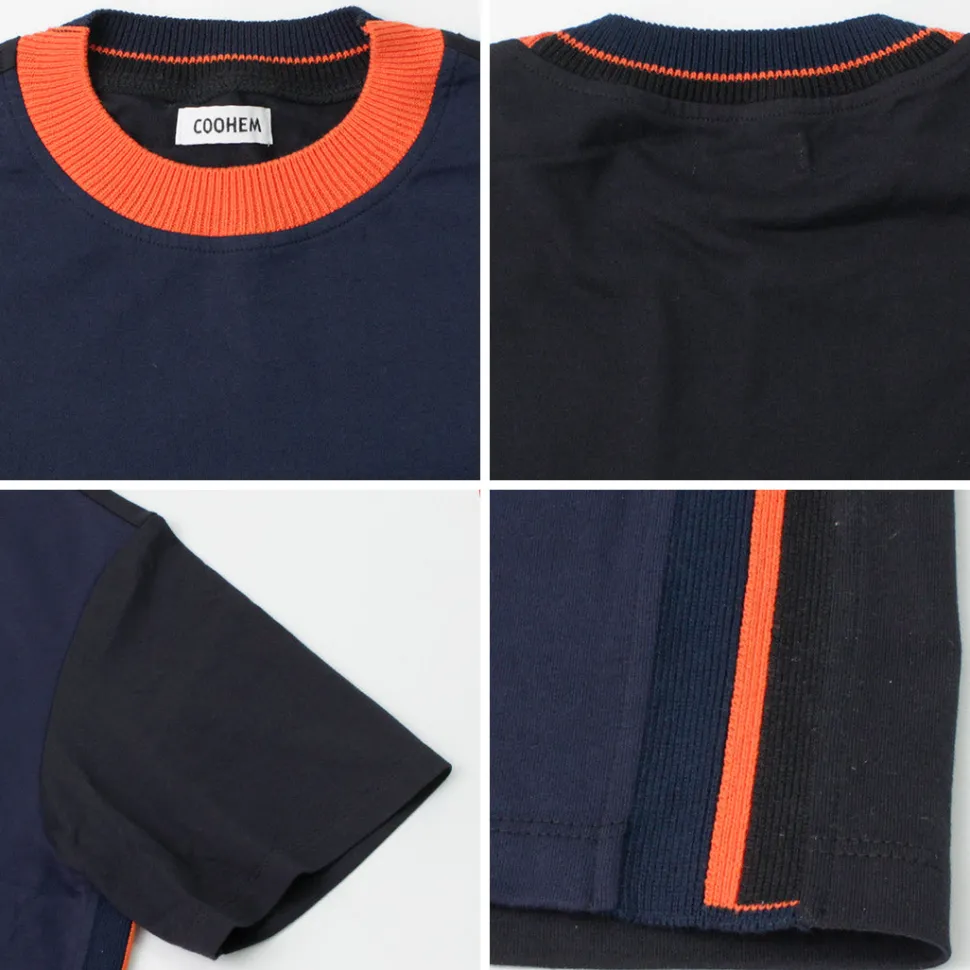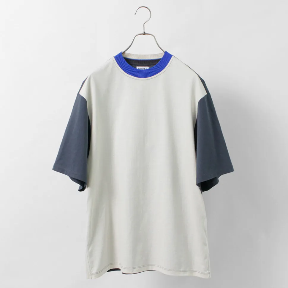 The body has a color block finish, combining different colored fabrics on the front and back. The appeal of this item is that it has a different atmosphere from printed T-shirts and patterned items.