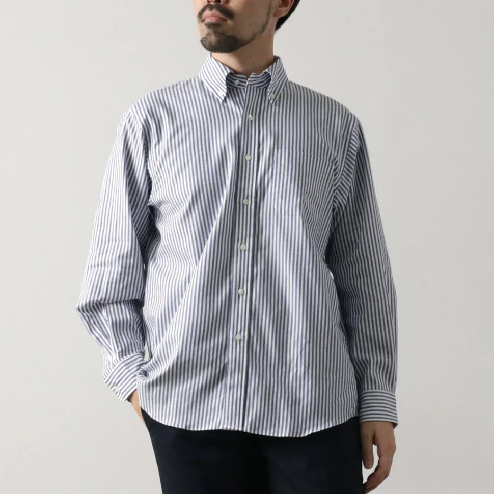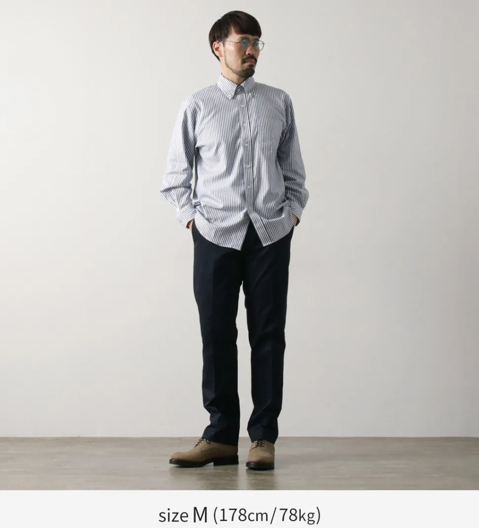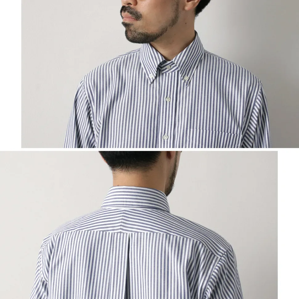 The collar features a simple button-down style, designed to be worn as an inner layer under jackets. The collar’s fit ensures it maintains its shape when worn with a tie. Additionally, the shirt is sewn with finer stitches than casual shirts, giving it a more sophisticated look. Even the buttons are sewn with a root winding method for added strength—showing attention to detail even in hidden areas.
