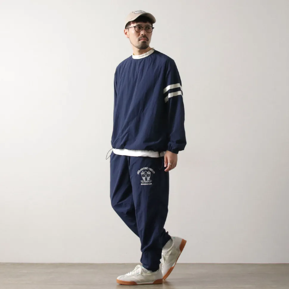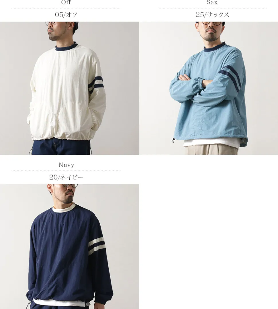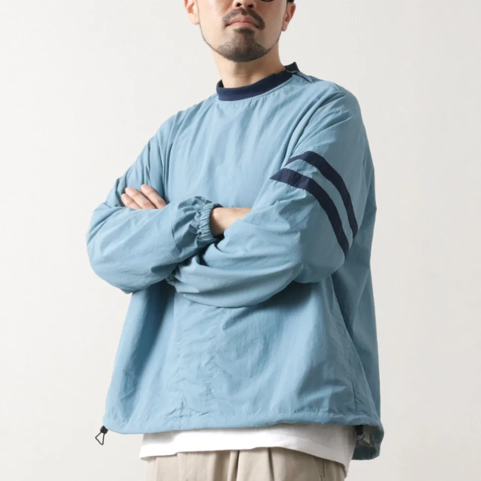 This item was created with the image of a product sold at the Ivy League university co-op store in the 1960s. The natural creased nylon cloth, the ribbed neck and the line design on the sleeves give this item a nostalgic feel.