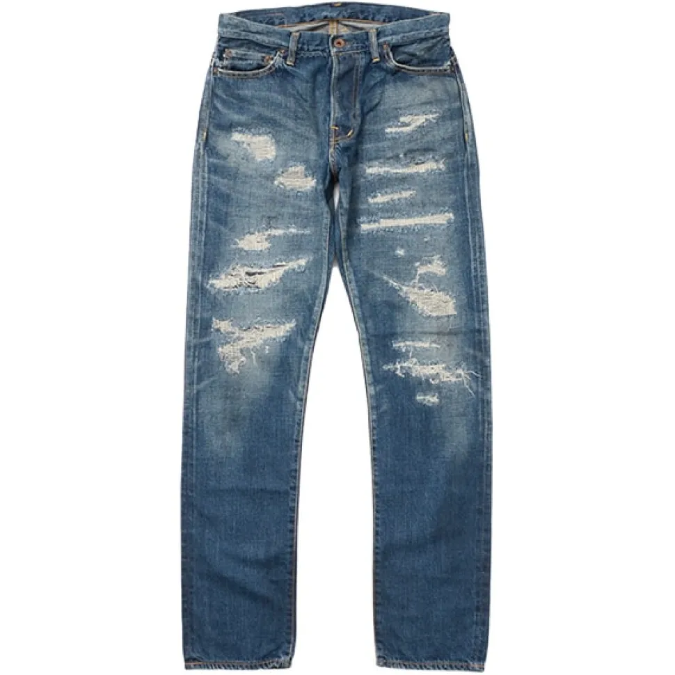 With intense damage and fading, these jeans have a vintage feel. These jeans are made from a light 12.5oz selvedge denim and have a tapered silhouette with vintage details around the thigh. Fabric for long-lasting wear
