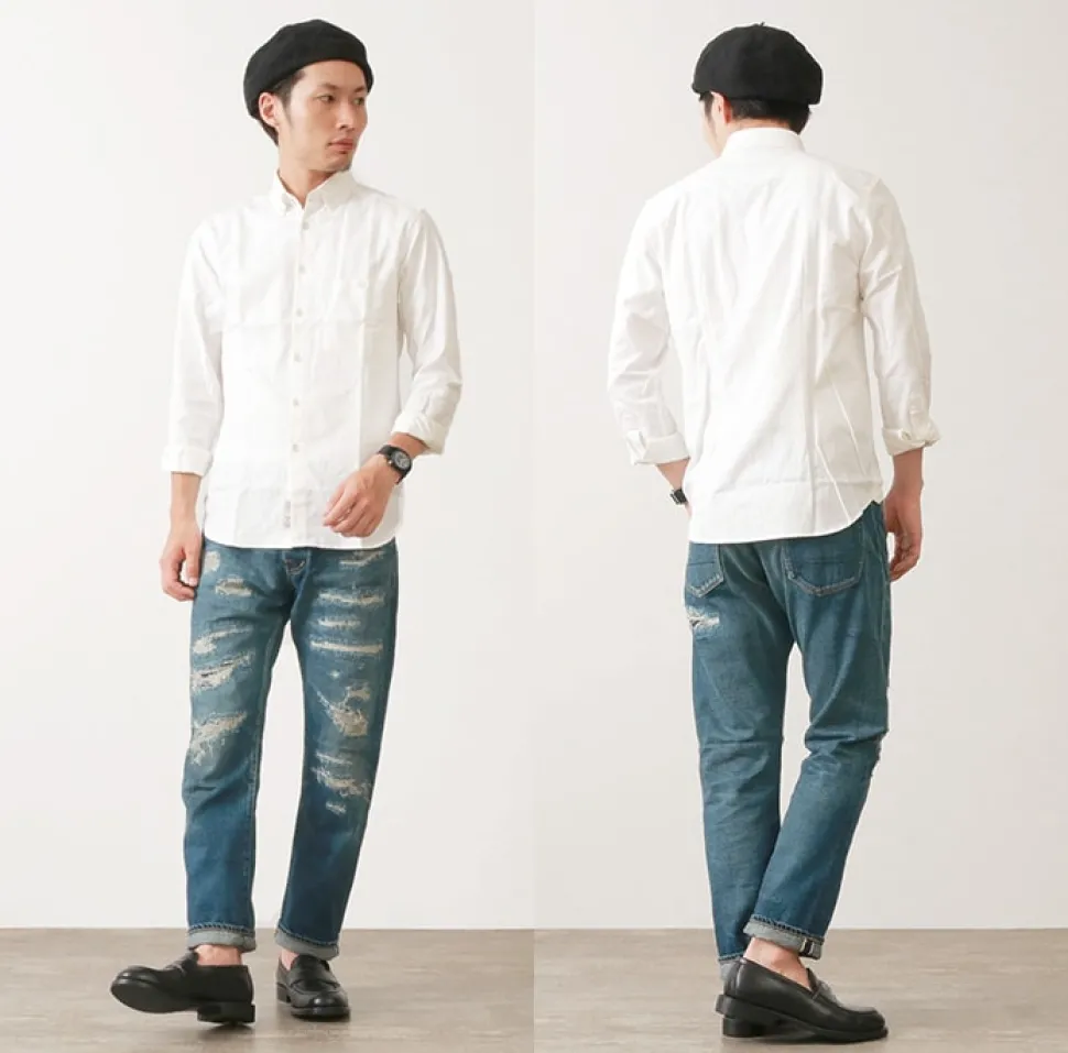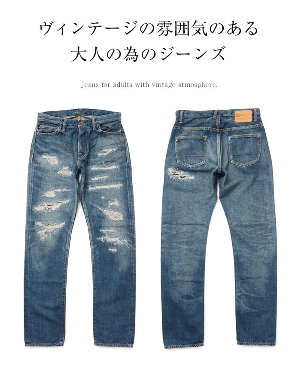 A pair of jeans for adults with a vintage vibe. The denim pants have a vintage vibe with intense damage processing and a powerful fading process. These are jeans for adults. 12.5oz selvedge denim. 12.5oz selvedge denim is a medium weight denim. The denim is moderately thick and supple, making it suitable for all seasons. The denim has a natural fade to it, which shows the high quality of the fabric. The more you wash it, the more it will age and the more it will take on texture. Tapered silhouette for a stylish look Tapered towards the hem for a sleek silhouette. The straight silhouette is not too tight, so you won’t feel cramped or stressed. This denim is suitable for all shapes and sizes.
