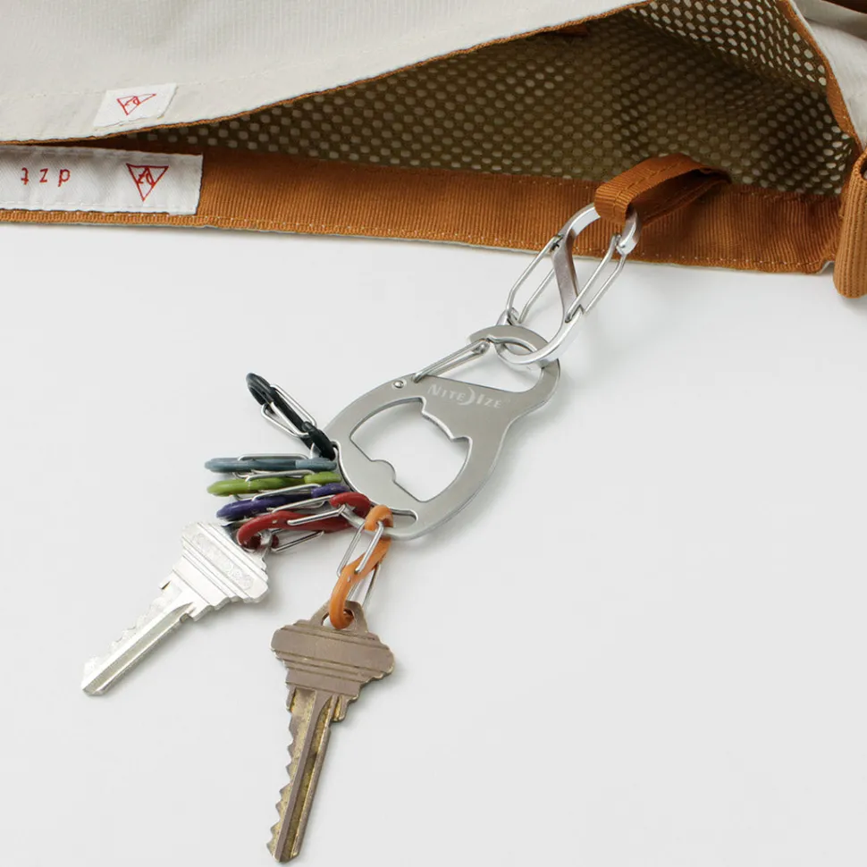 A carabiner is attached inside, perfect for attaching keys. The thoughtful details make it appealing.