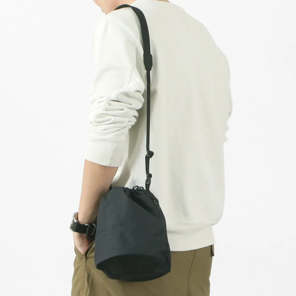 It can be worn diagonally over the shoulder, around the neck like a neck strap, or as a drawstring pouch by removing the strap. It can also be used as a drawstring pouch by detaching the strap.