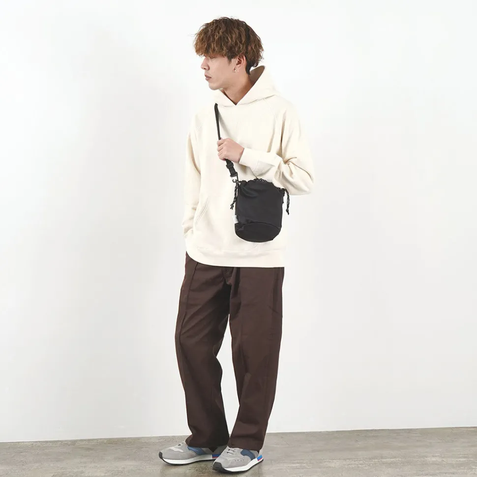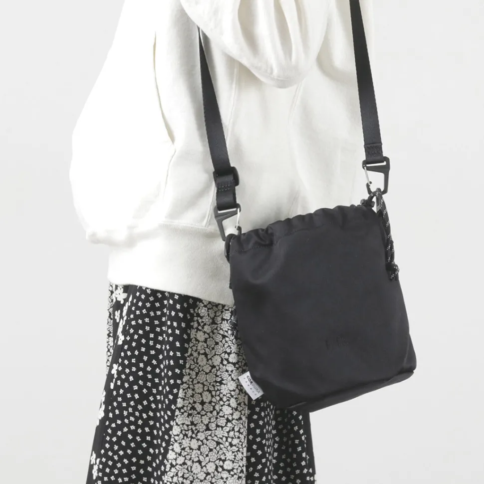 This drawstring shoulder bag is inspired by the chalk bags used in climbing and bouldering. The fabric is the world’s first “Cordura nylon satin,” which was jointly developed with INVISTA. This fabric is highly durable, yet has an elegant satin texture.