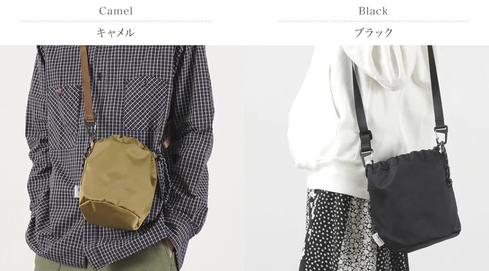 This drawstring shoulder bag is inspired by the chalk bags used for climbing and bouldering. The fabric is the world’s first “Cordura nylon satin,” which was developed in collaboration with INVISTA. This fabric is highly durable, yet has an elegant satin texture. The compact size is perfect for a quick trip to the shops, a festival, or a trip to a destination.