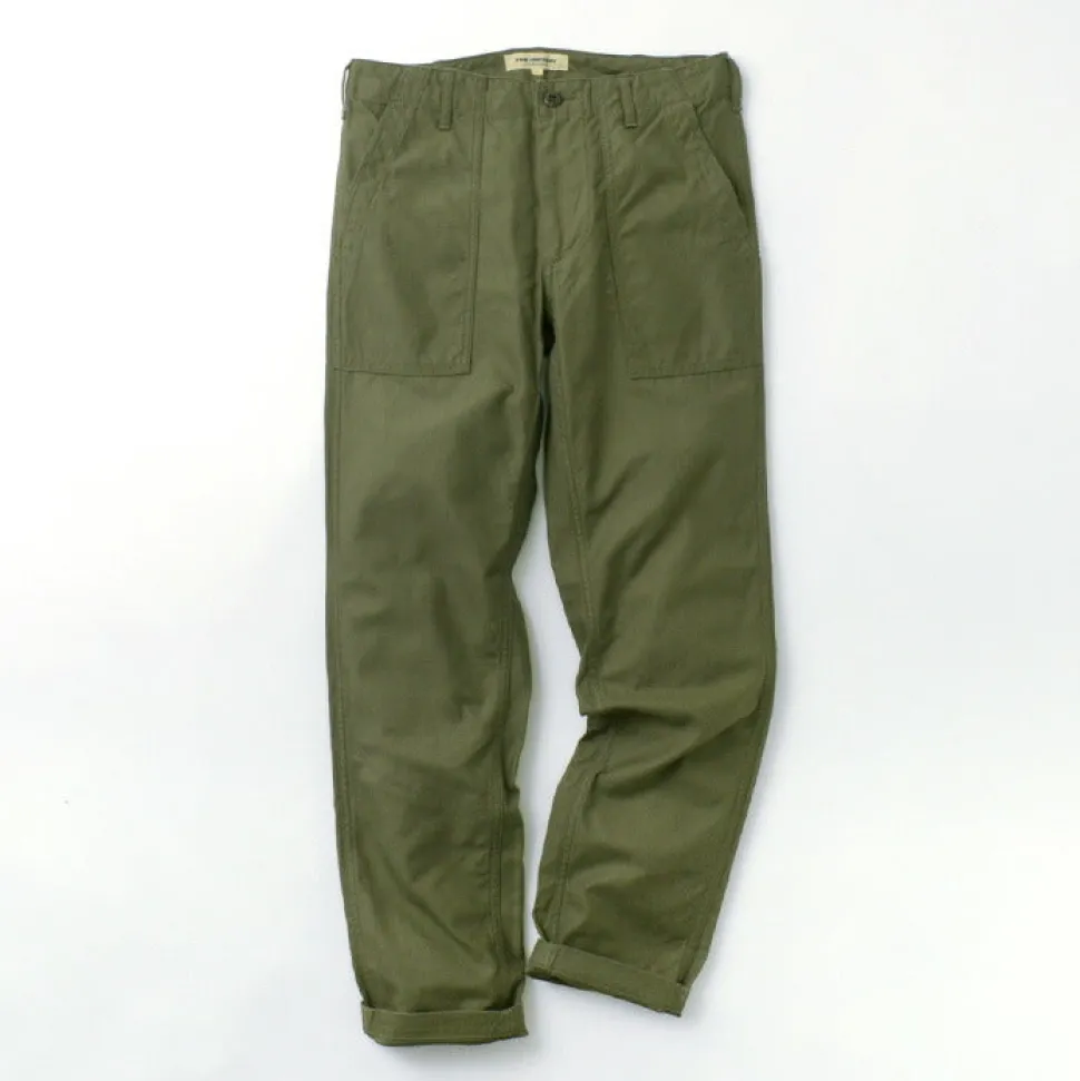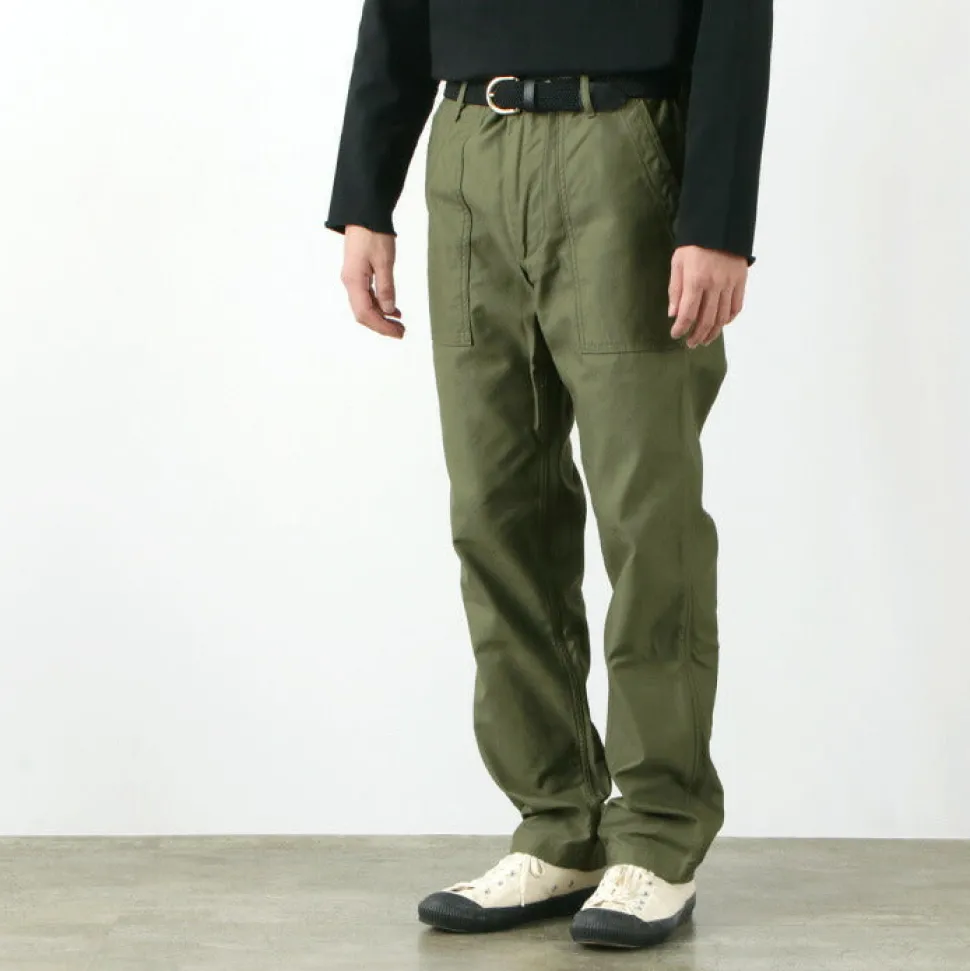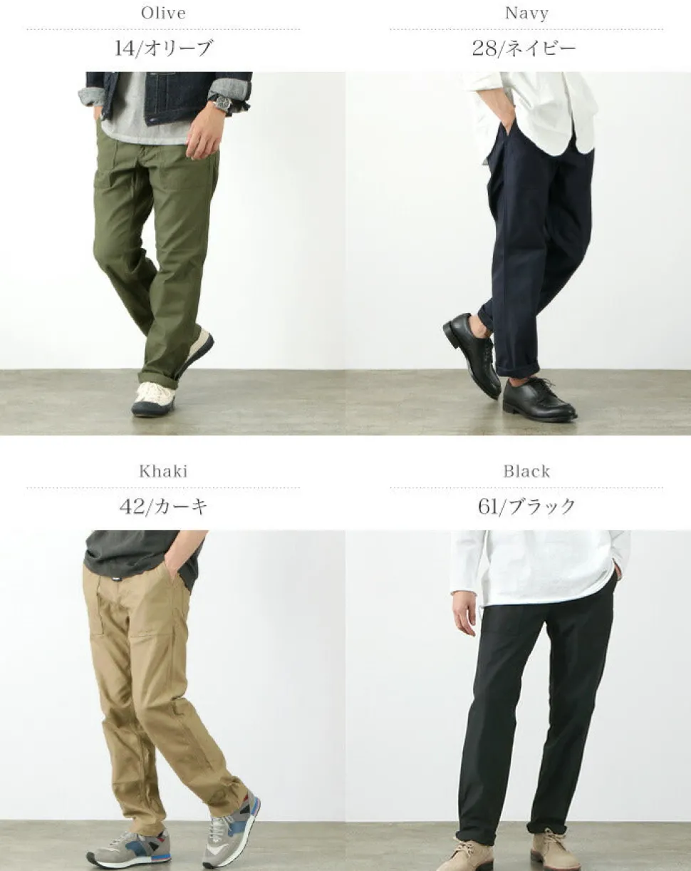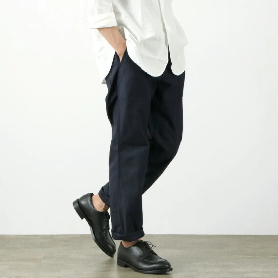 These pants are a modified version of the 1950s American military fatigue pants. Retaining the rugged details of military design, they feature a beautiful silhouette that tapers toward the hem.