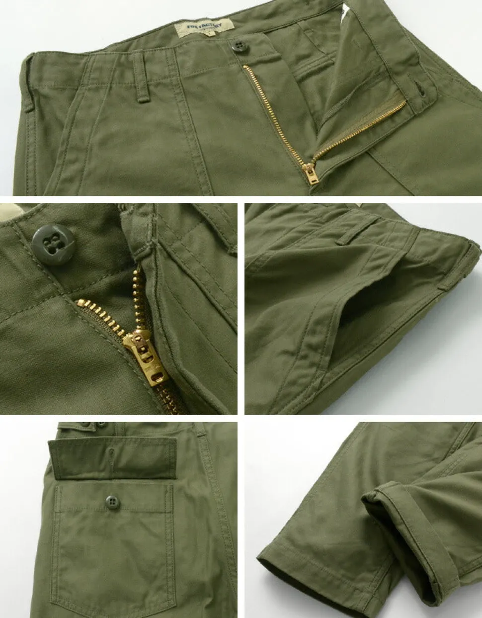 These are modified versions of the American military fatigue pants from the 1950s. While retaining the rugged military details, they have a beautiful tapered silhouette towards the hem.