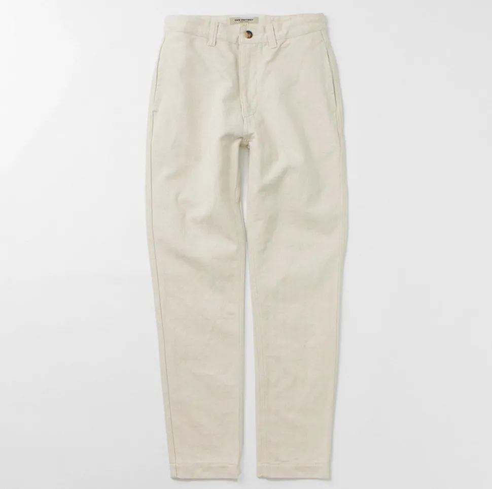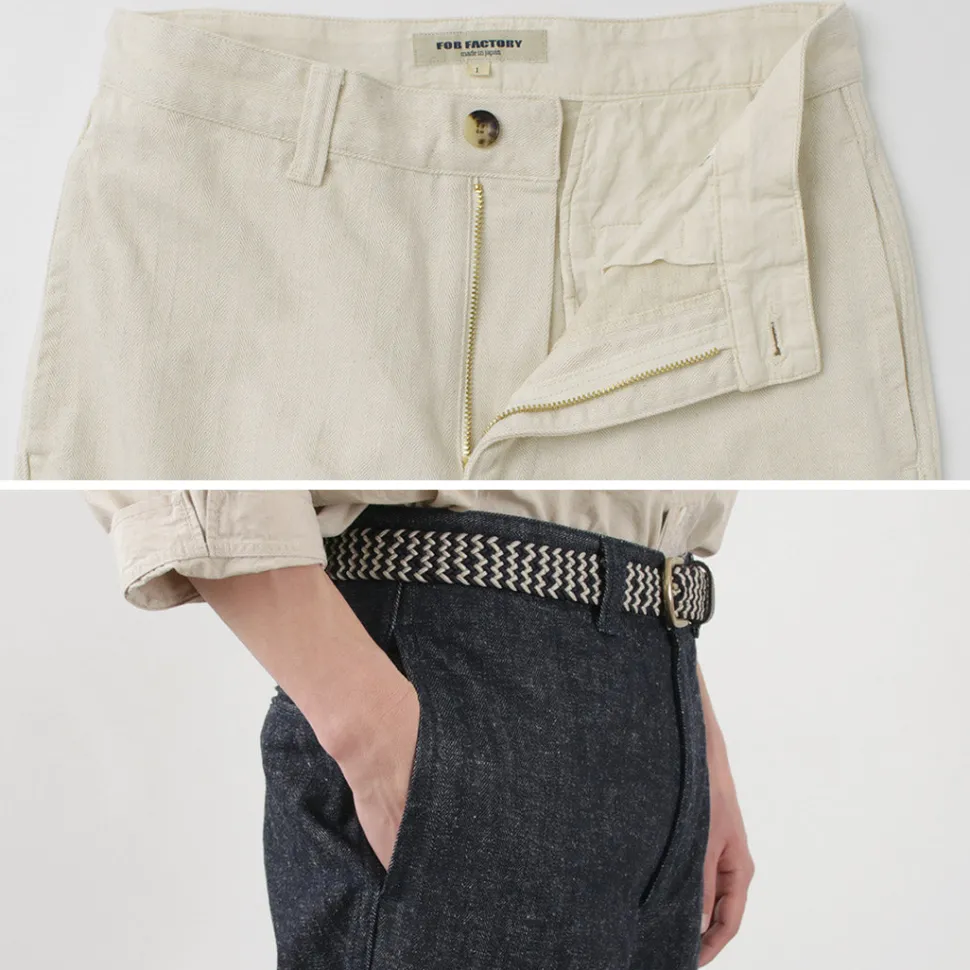 The original hemp-blend herringbone fabric with a cool feel on the skin and a rough look is used. With a tapered silhouette that can be worn just right or oversized, these trousers work well with a wide range of styles, from clean to casual.