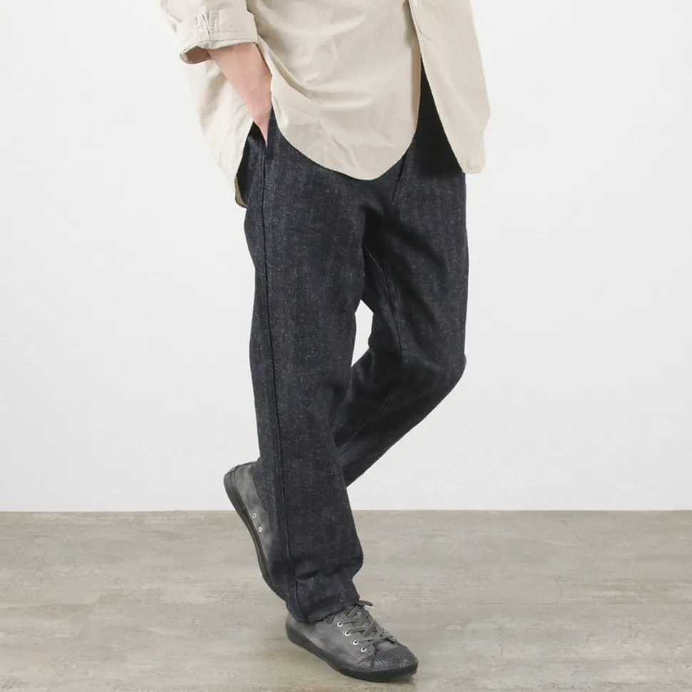 The original hemp-blend herringbone fabric has a cool feel on the skin and a rough look. With a tapered silhouette that can be worn just right or oversized, these trousers are ideal for a wide range of styles, from clean to casual.