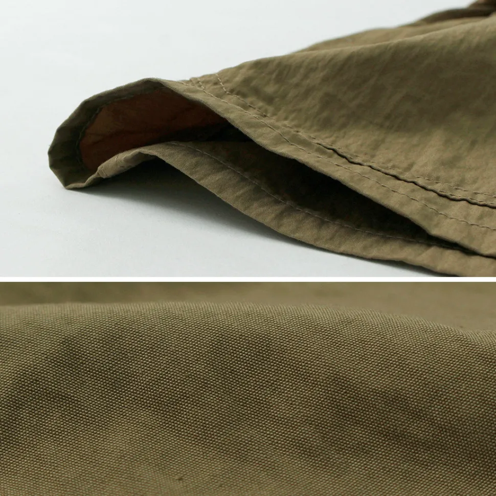 The fabric reproduces the material specified by the U.S. military for the “PARKA, SHELL-M1951,” a parka used for cold-weather protection, also known as a fishtail or mods parka. Lightweight yet durable, it was designed to be worn over jackets. The material combines 30-count cotton in the warp and 100D nylon in the weft, woven together at high density. This blend of cotton’s natural texture and nylon’s lightweight functionality gives the fabric a crisp, soft, and durable quality.