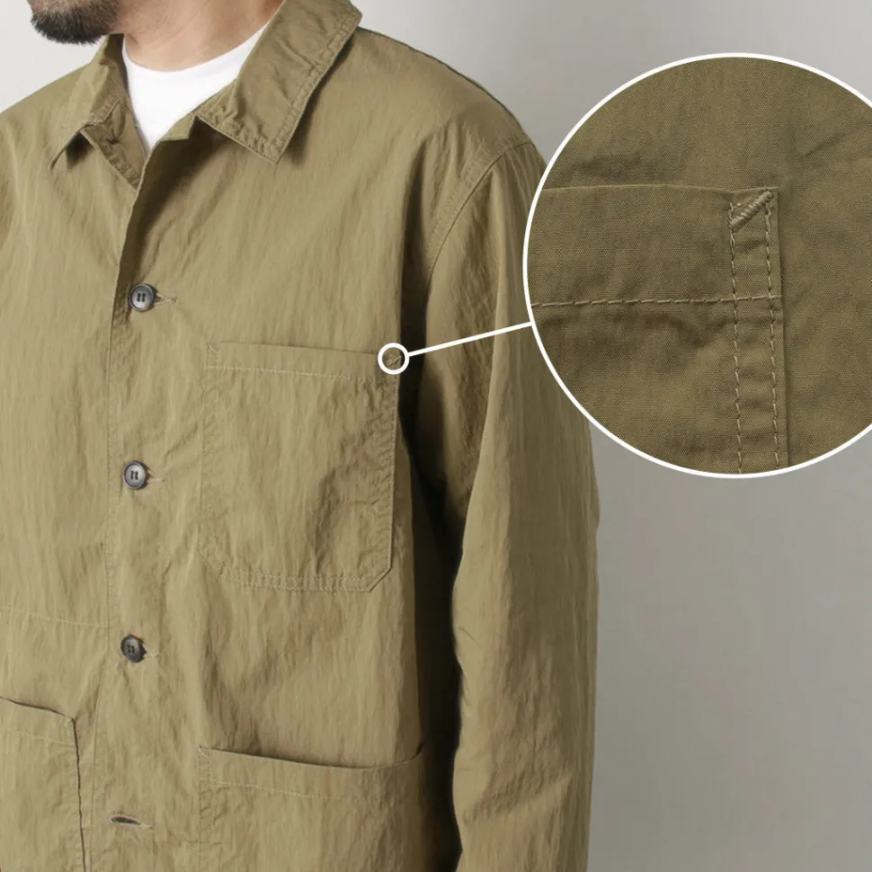 The moderately roomy and elegant silhouette can be enjoyed as a shirt for town use, while the lightweight and strong fabric creates a hybrid atmosphere that evokes outdoor and military tastes.