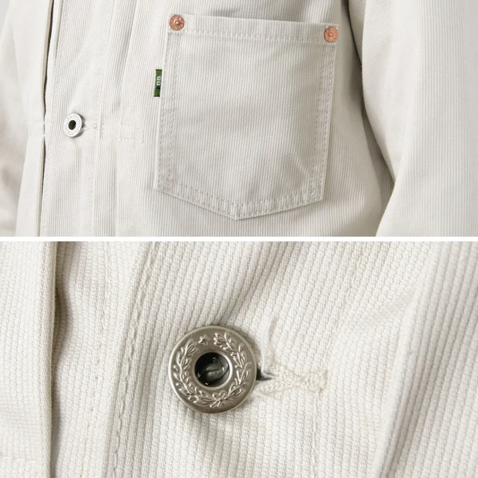 The silhouette is a calculated boxy shape that’s not too tight, with a slightly longer length. It is adorned with two-pronged laurel pattern tack buttons and brand-embossed rivets, creating a workwear-inspired jacket that maintains an elegant, mature, and dignified impression thanks to the piqué fabric.