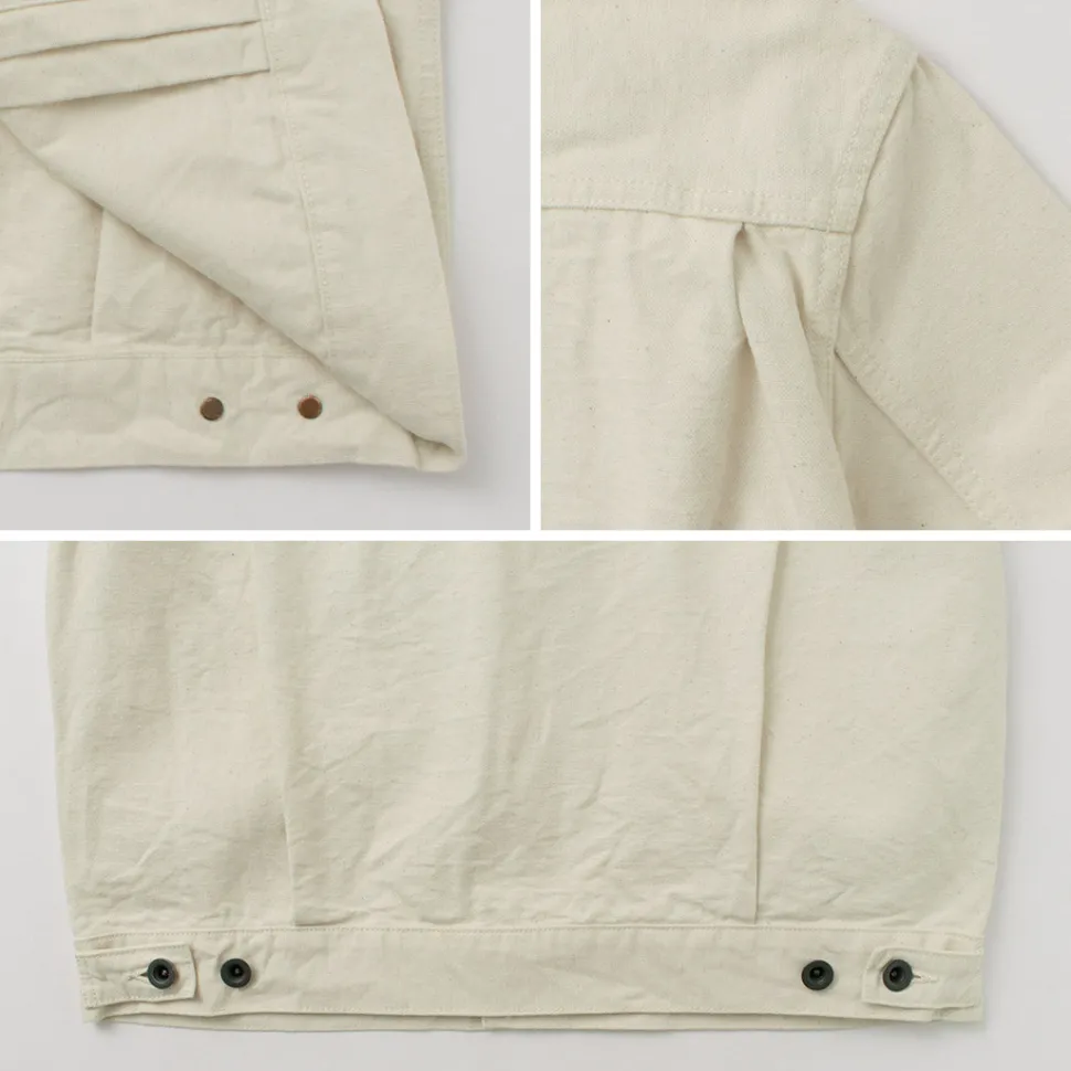 The left chest pocket, inspired by the original denim jacket model, features rivets for durability. The front pleats not only add a vintage touch but also allow the body width to expand with movement.