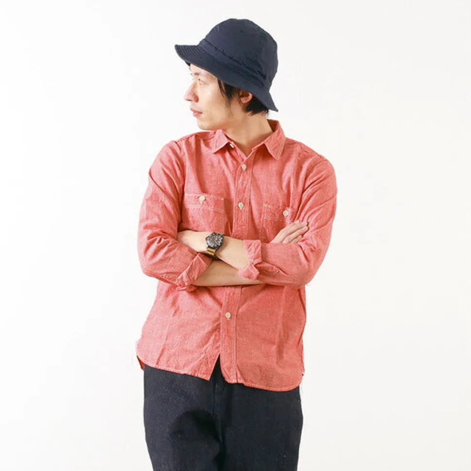 Tight and clean silhouette, in keeping with the work shirts of the 40’s, this adult work shirt has a clean and simple silhouette. FOB’s original Selvic Chambray is woven on an old-style power loom at a tension as close to hand-weaving as possible, slowly and carefully, so you can feel the original texture of the cotton, the rustic look with unevenness, and the natural rough feeling. The selvic is used on the gusset of the shirt as a point of reference. Selvic is used in many places on vintage shirts because it does not unravel. Details & PartsThe collar is a little smaller so that it looks nicer when layered. The main stitching is double stitching. The buttons are the plate buttons that were common in the 40s and 50s. The double pockets without flaps are also a detail of that time.