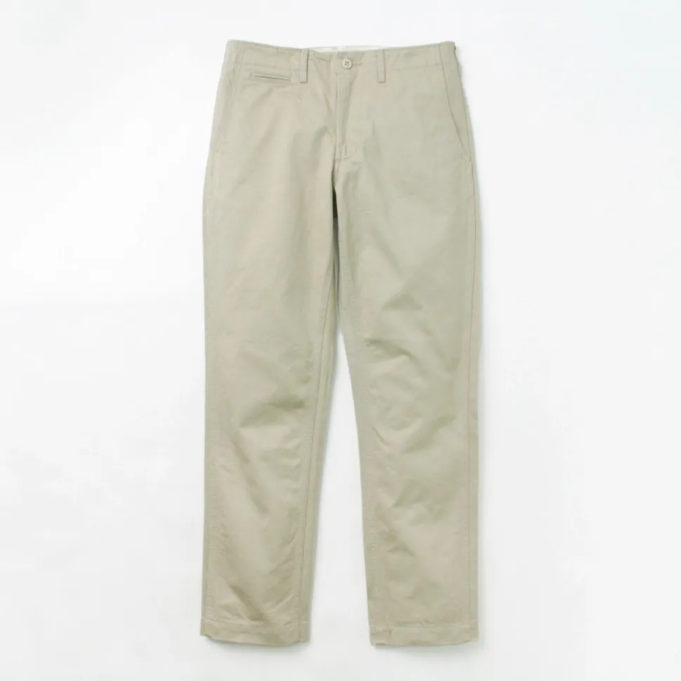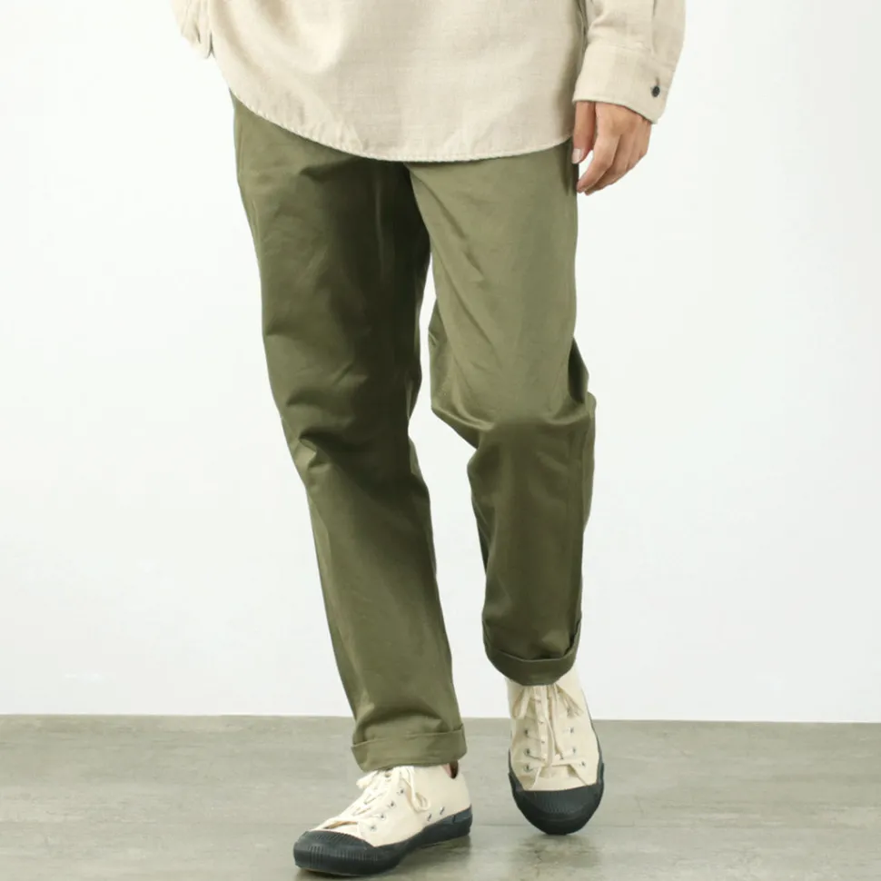 Based on the U.S army Chino trousers, details such as ball-rimmed pockets and rolled seams are reproduced and fused with a slim, clean silhouette typical of F.O.B FACTORY. A brand new pair that can be worn with any outfit.