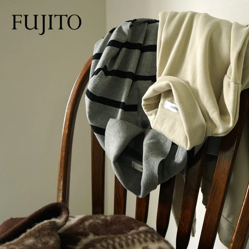 FUJITO introduces a lager shirt with an eye-catching thick stripe pattern. This is a piece with FUJITO’s unique specifications, a knit sweater made from a lager shirt like the one worn by the famous painter David Hockney. It features a comfortable fabric and a moderately loose silhouette.