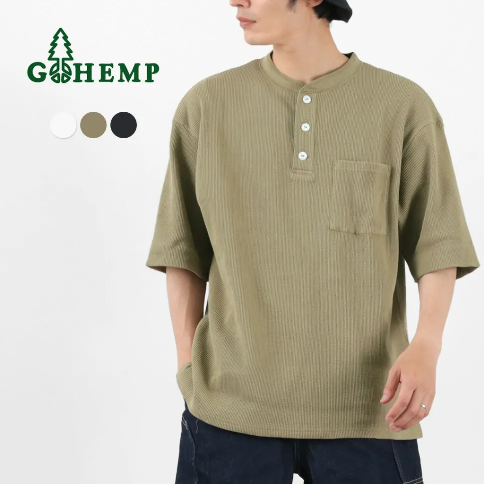 GOHEMP introduces a waffle henley neck T-shirt that can be worn alone.