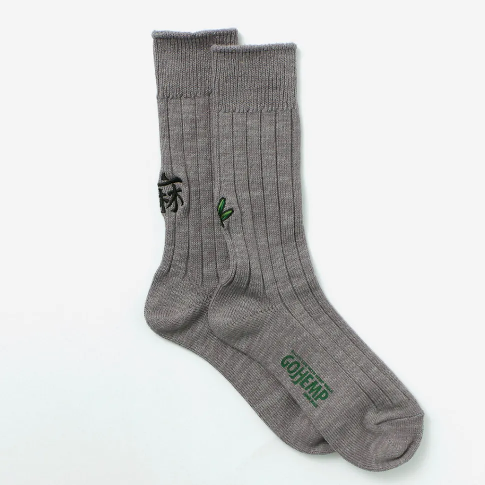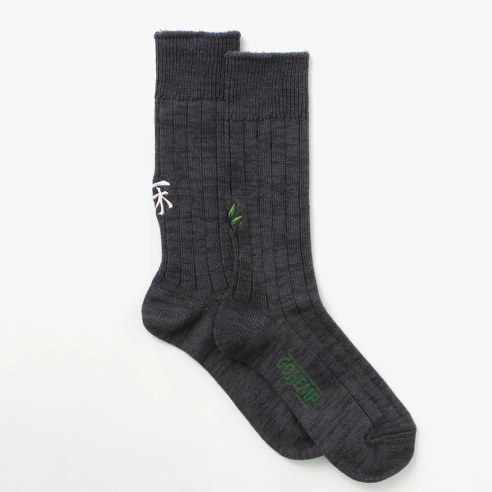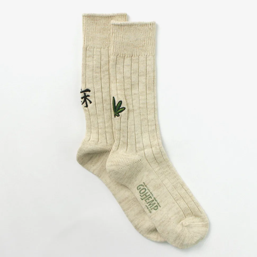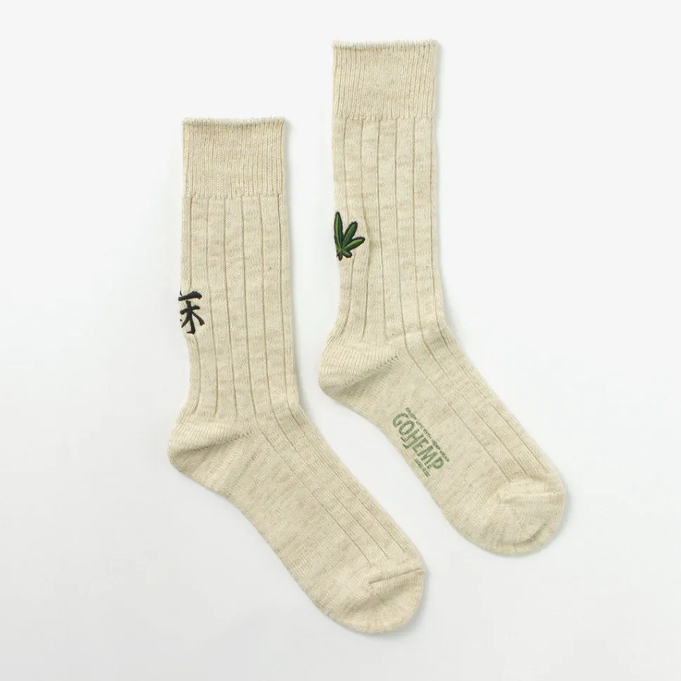 From the front, these crew socks appear to be conventional. However, their distinctive feature lies in the bold embroidery of the character “麻” (hemp) on the back.