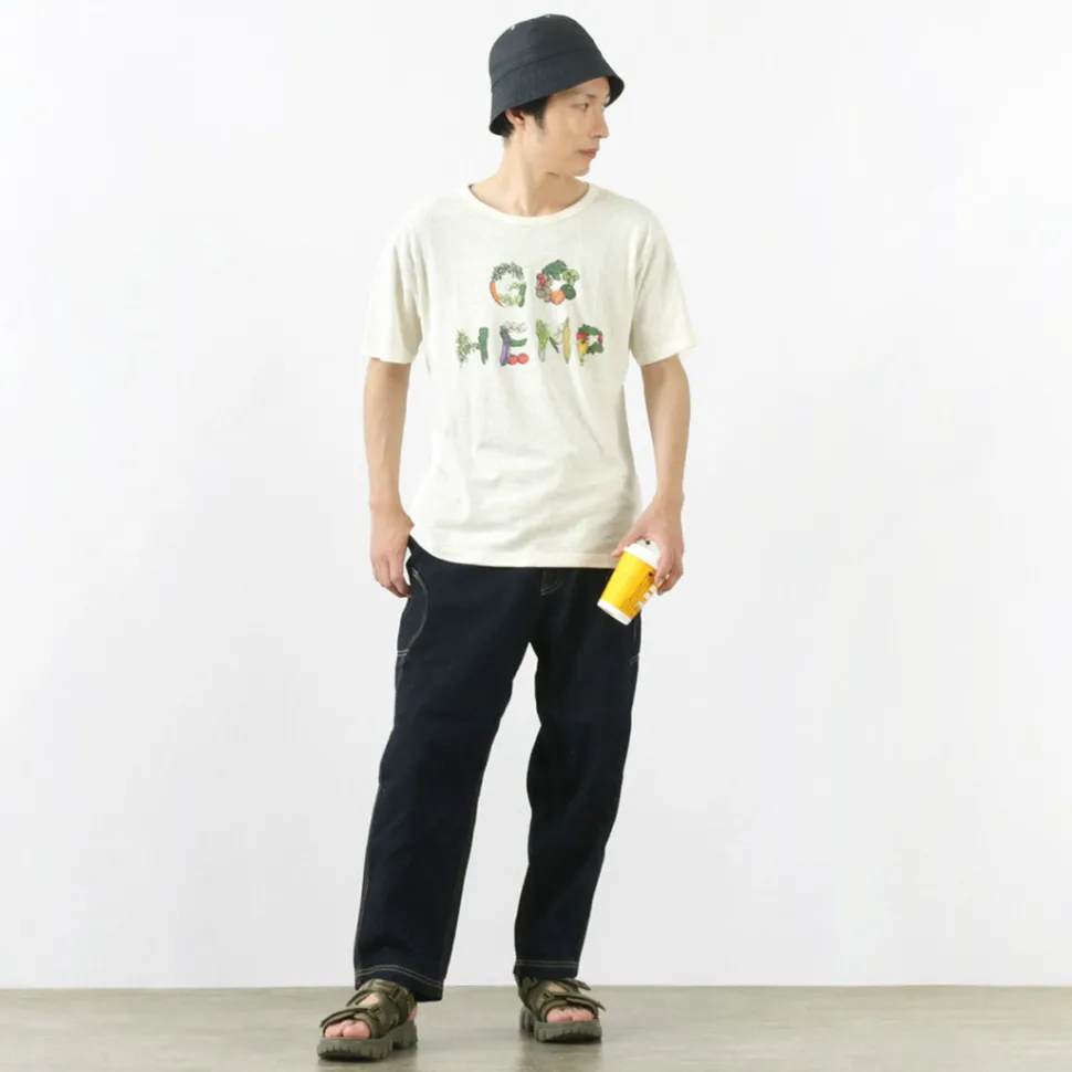 Printed T-shirt designed under the theme ‘hello nature’ from GOHEMP ART LABO. The print expressing the brand name in veg and herb has a colourful and energetic impression, but combined with the softness of the body, it creates a warm atmosphere that is not too flashy.