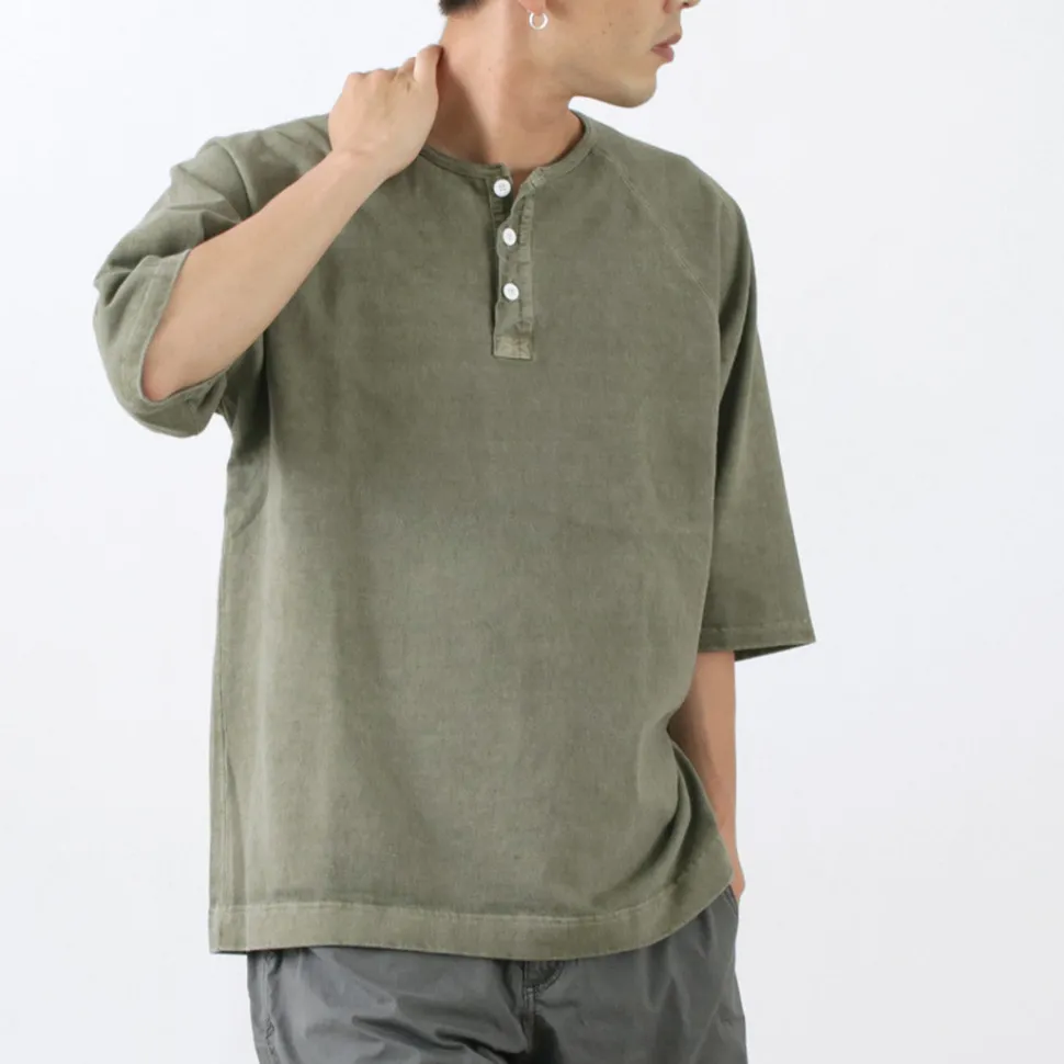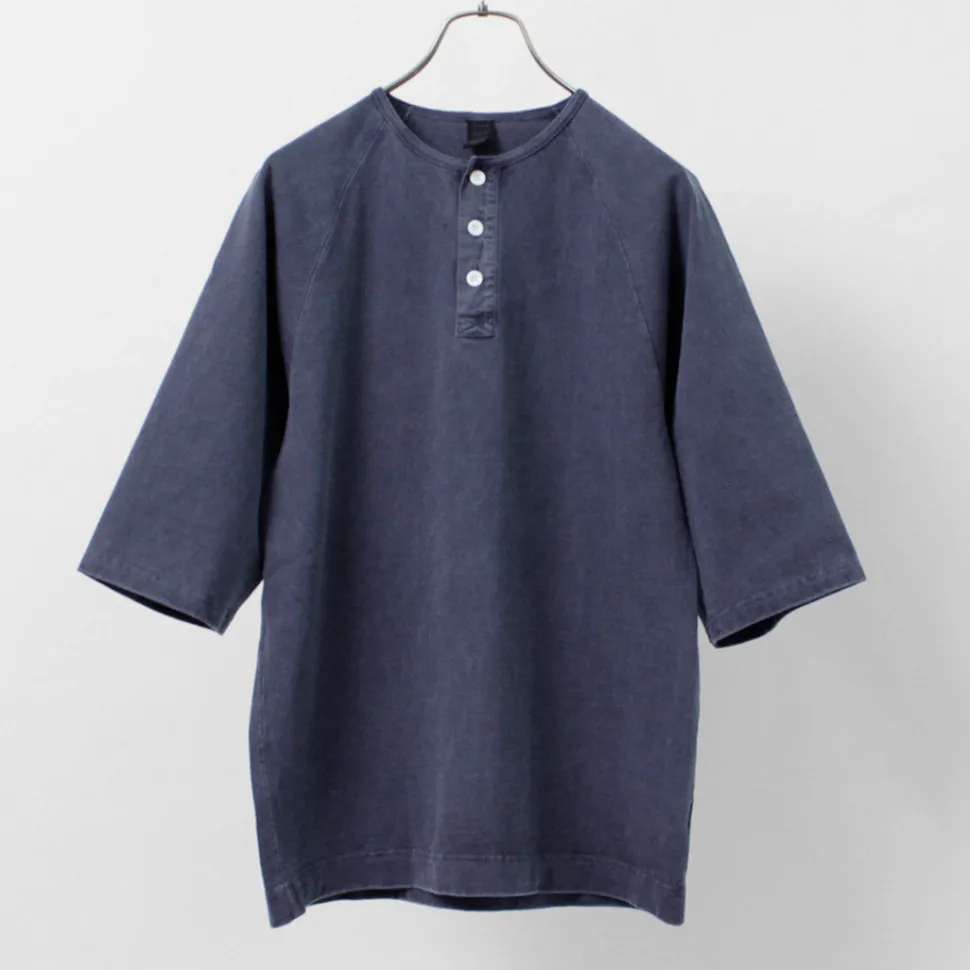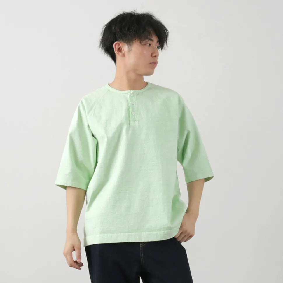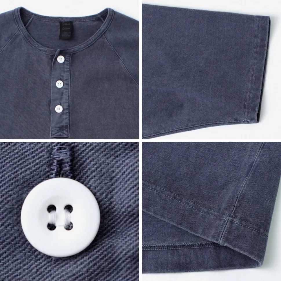 The neckline features a Henley neck with a fine binder. The Henley neck is named after the shirts worn by participants in the Henley Royal Regatta, a boat race held on the River Thames in London, and is a fashion detail with a long history. The placket uses woven fabric, adding to its charm. The sturdy sewing supports the heavyweight fabric, and the raglan sleeve design ensures ease of movement without feeling bulky.
