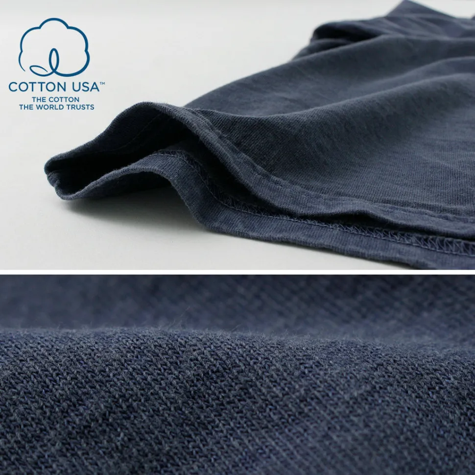 The fabric is made from 100% American cotton spun using open-end yarn (18 singles). The 5.5oz jersey fabric is knitted to provide a comfortable thickness that naturally fits the skin, offering excellent stretch and durability.
