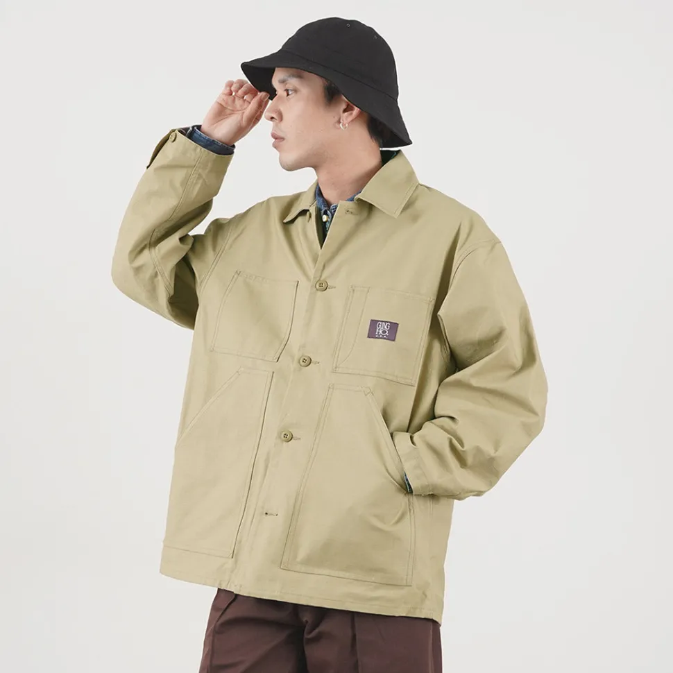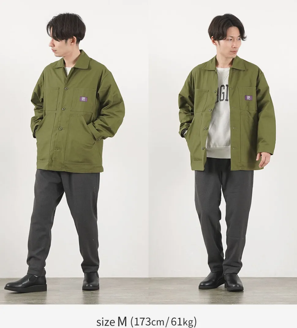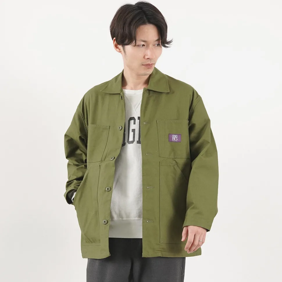Fatigue cover jacket” is an updated version of the classic jacket that has been produced in the GUNGHO U.S. since the 1990s. Fusing elements of military fatigues jackets with coveralls, this piece features large utility pockets and a box silhouette. The