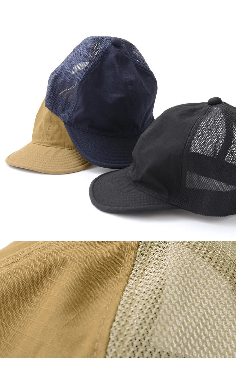 Mesh material is added to high-density, water-repellent cotton nylon ripstop fabric. This cap is breathable and lightweight, and can be worn easily in summer.