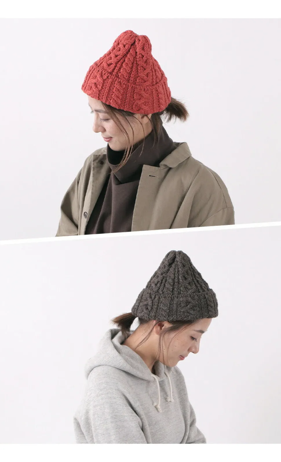 Cable knitting is a knitting technique in which the eyes are crossed to create a twisted, rope-like pattern. The roughly knitted, hand-knitted texture is gentle and extremely warm. It is made on hand-frames (hand-knitting machines), which gives it a deeper feel.