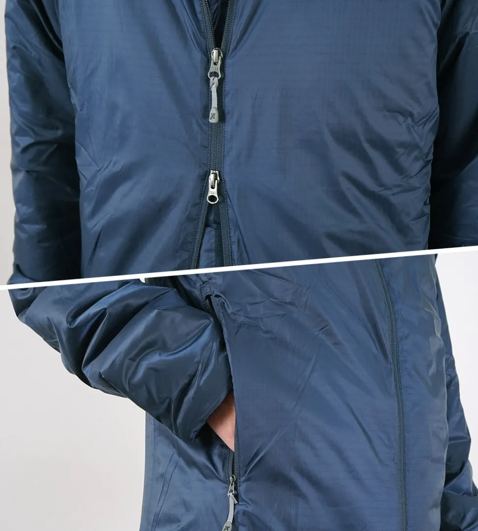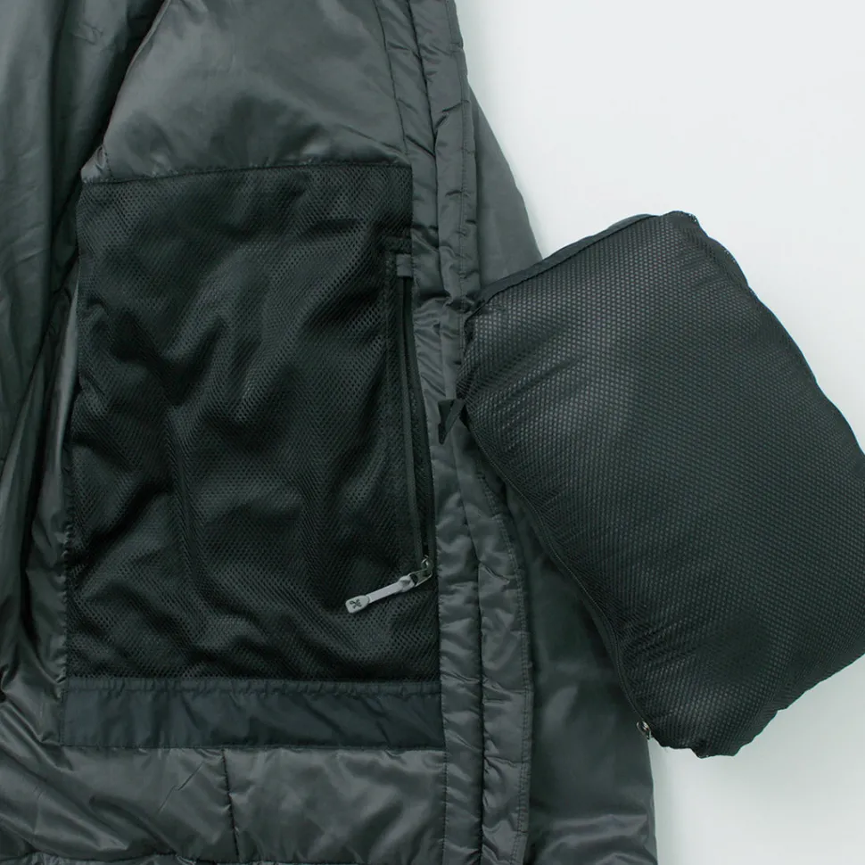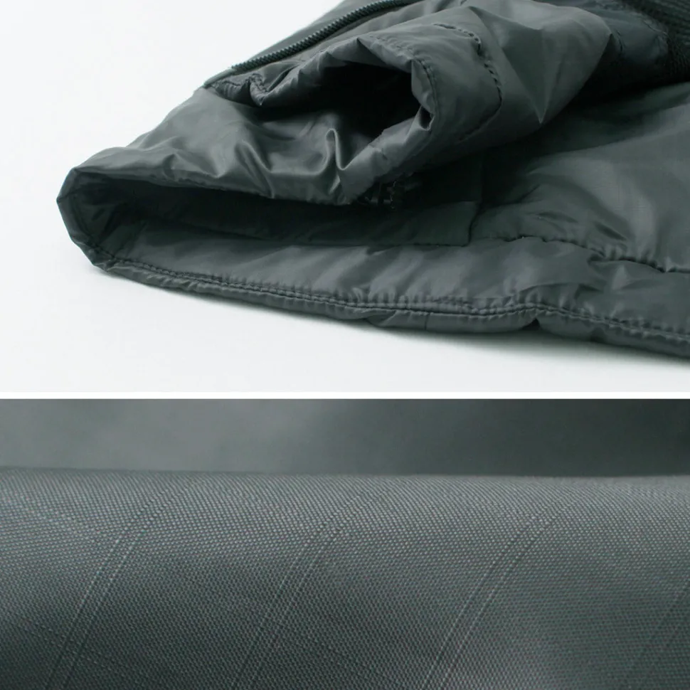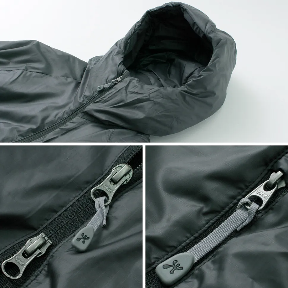 The “Spinner Ripstop” is made entirely of polyester, from the outer fabric to the padding. PRIMALOFT Gold Insulation is used as the insulating material, providing high heat retention and insulation at a light weight. In addition, its water repellency keeps heat from escaping even when damp and prevents moisture from entering the inner layer.