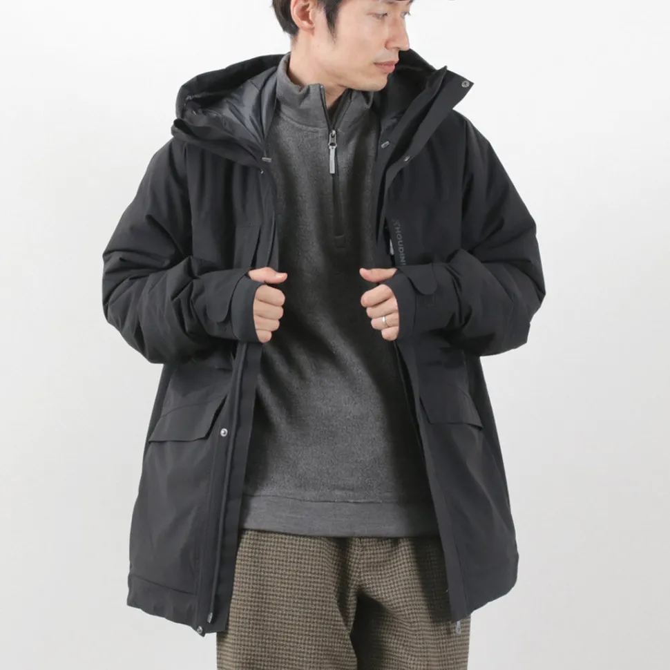 By zipping up the topmost part of the zipper, it securely covers up to the chin, providing excellent warmth. It also features drawcords on the hood, neckline, and hem for easy fit adjustment.