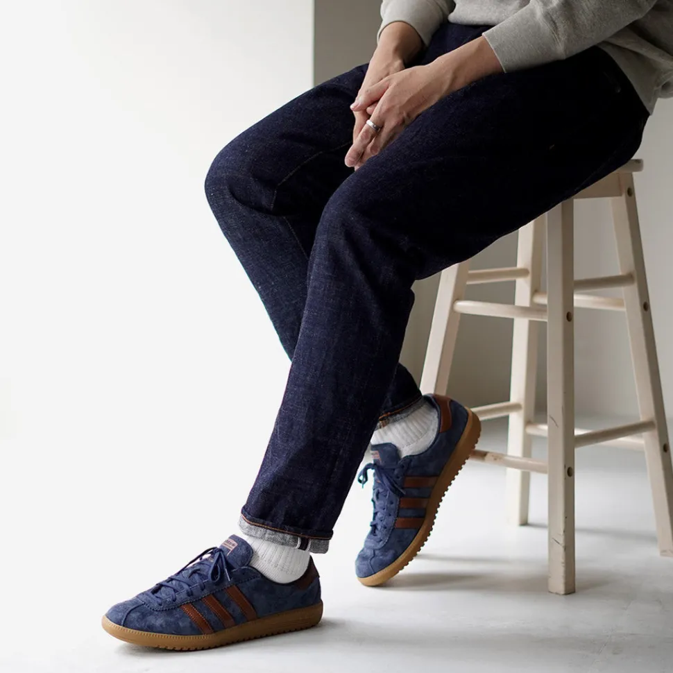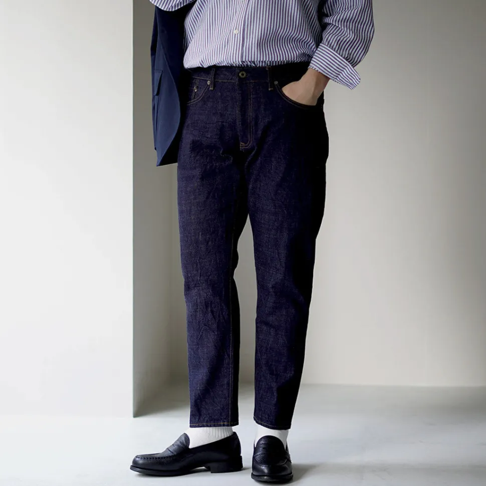 A special order of JAPAN BLUE’s signature ultra-thick denim “Monster” in a modern form, available in two different styles: a 9/10 length and a full length.