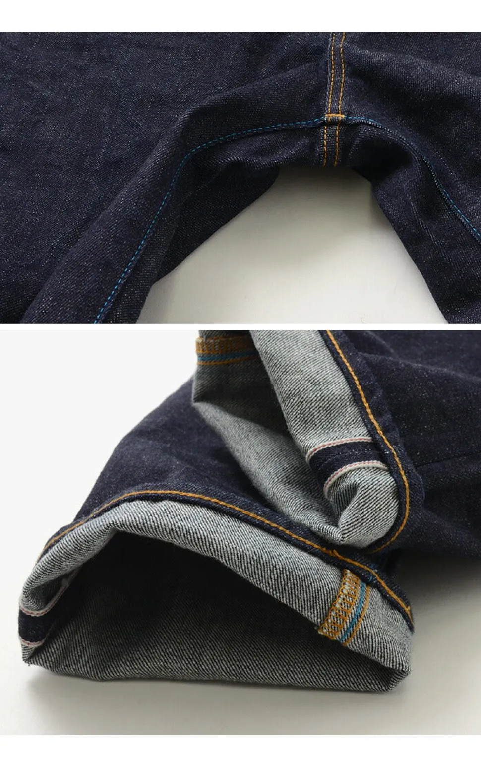 stitching is in the classic jeans orange and the brand’s bright blue accents. Roll up the hem and you’ll see a glimpse of the serviette, a sign that the jeans were woven on an old power loom.