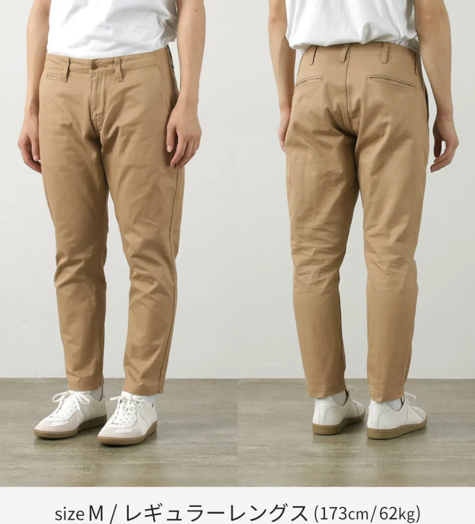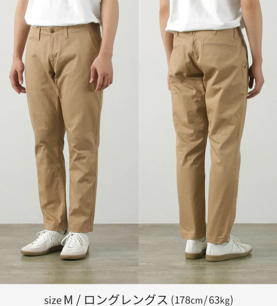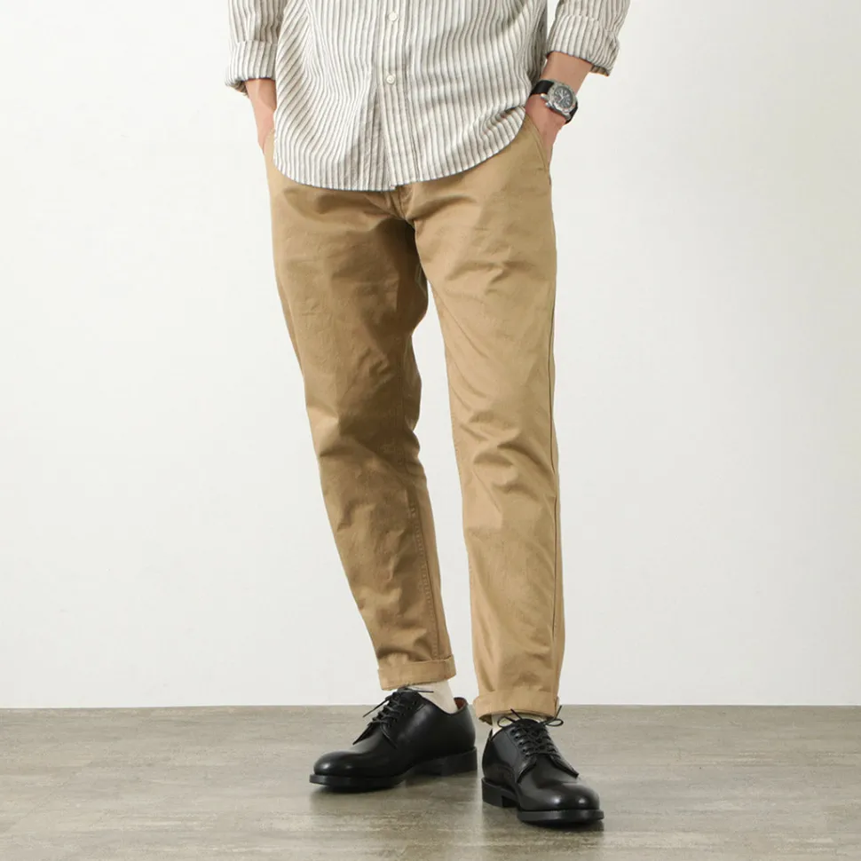 The tapered silhouette is characterized by a considerably wider hip and armpit setting, and a sharply tapered shape from the knee to the hem. Even sportsmen with strong thighs can easily wear these chinos.