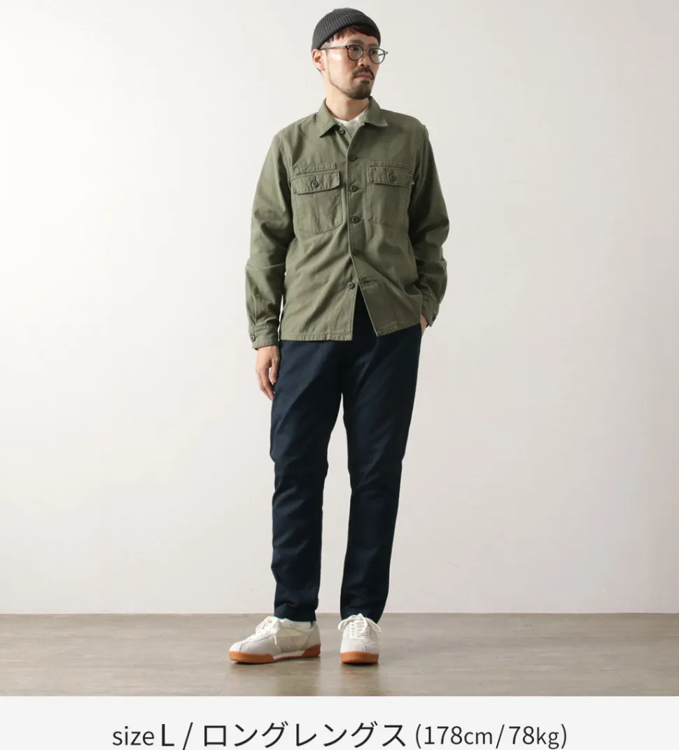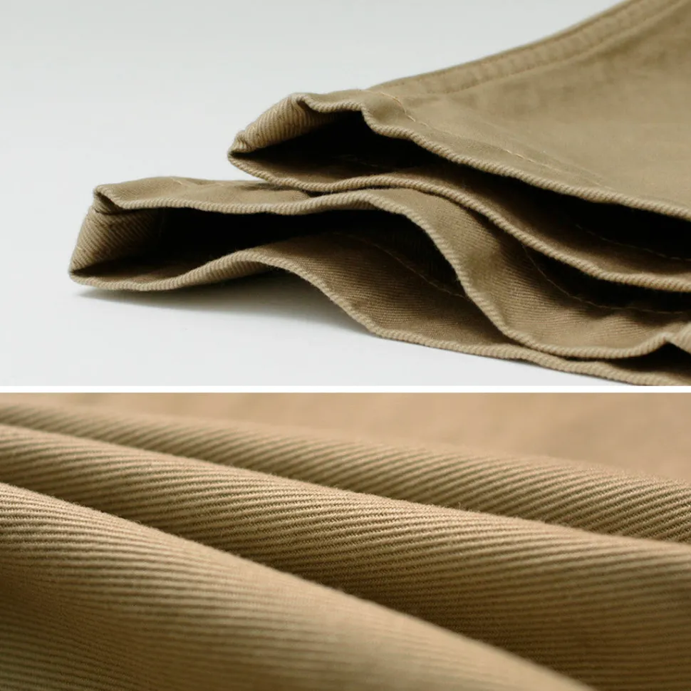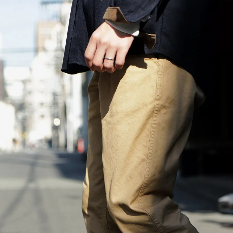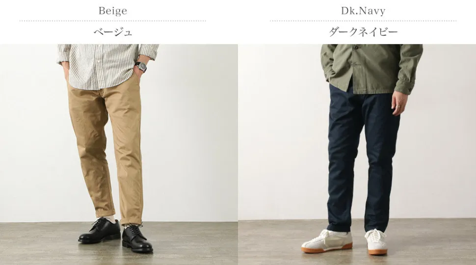 The fabric is made from 40-count three-ply yarn, which is finer than typical chino pants yarn. This high-density weave gives the fabric a firm texture, a refined sheen, and high durability. Despite requiring advanced techniques, this fabric offers excellent cost performance. Free from the bulkiness typical of chinos, these pants are suitable for various occasions.
