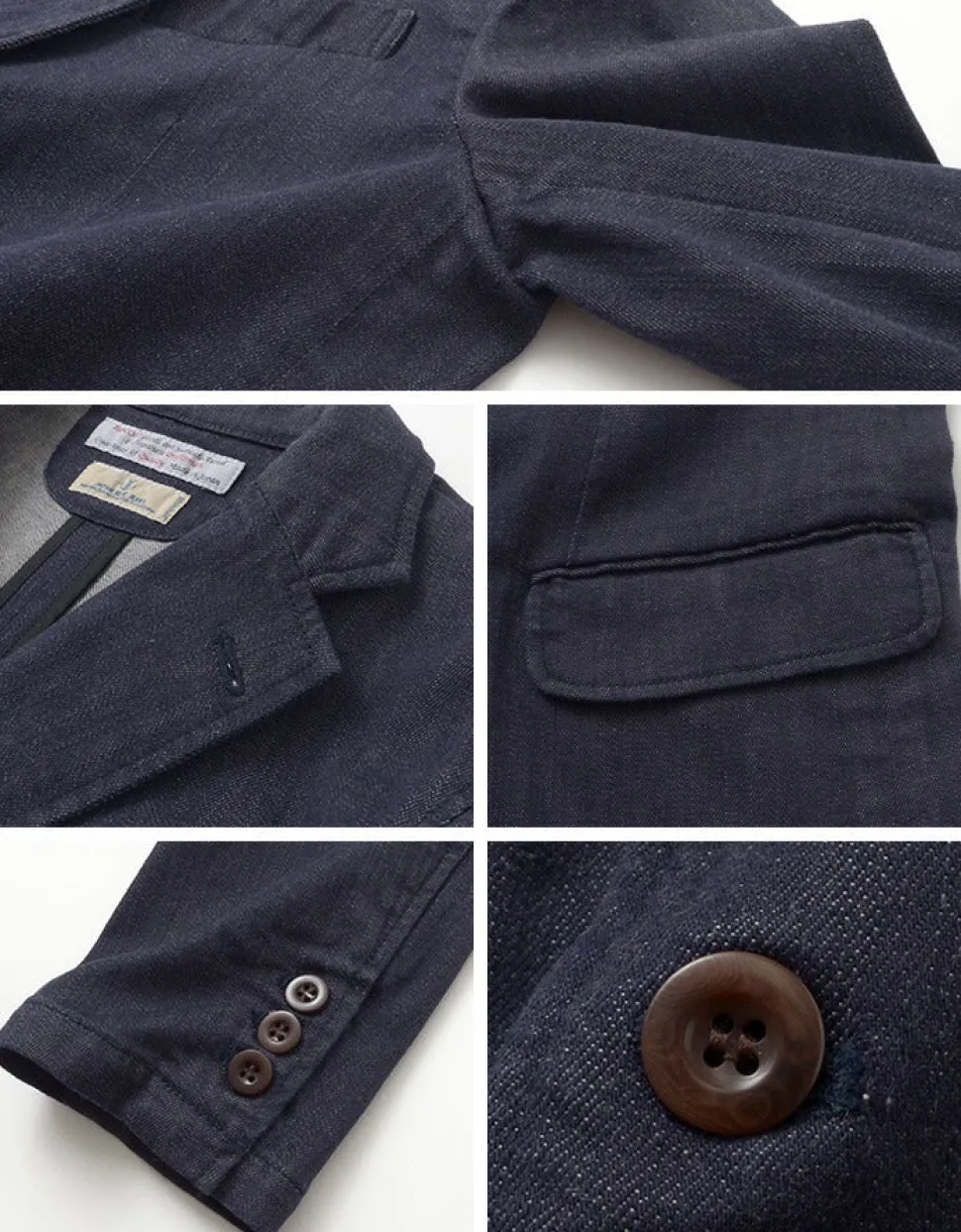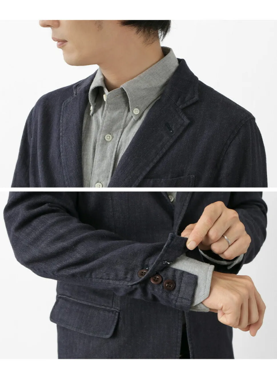 Simple two-button, classic collar with Notched lapel. The pocket flaps can be in or out. Buttons are also deployed at the cuffs as in tailored suits, and you can roll up the sleeves and wear them out. The