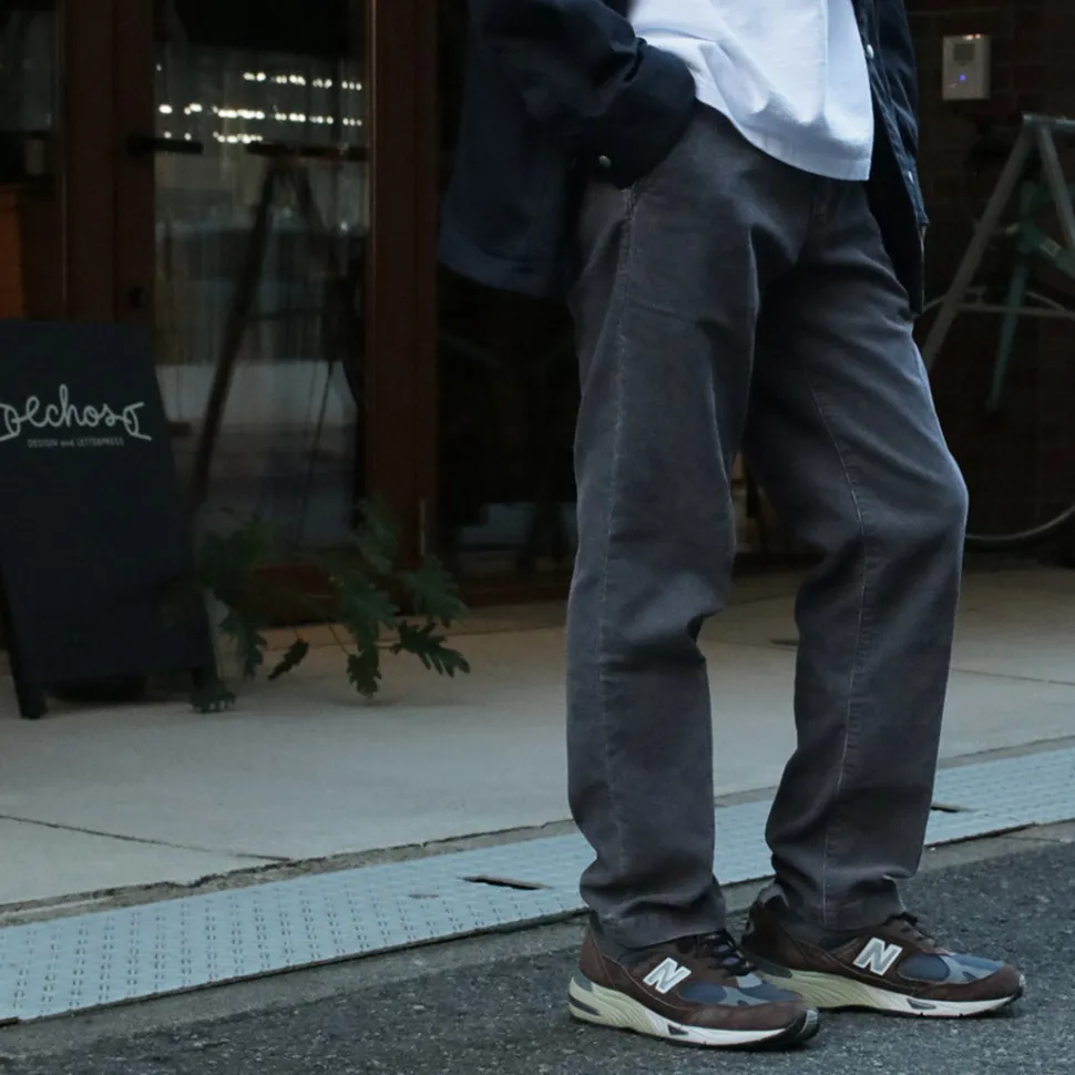 Our popular “JAPAN BLUE JEANS x ROCOCO Officer Tapered” trouser series. A new officer trouser specially ordered in corduroy fabric with a sulphide-dyed finish. The vintage-like finish allows you to enjoy the unevenness and bite from the moment you start wearing them. The colour will fade away moderately with repeated wear, and you can enjoy the ageing effect of the fabric like denim. The silhouette is narrowed towards the hem for a classy look, while giving a