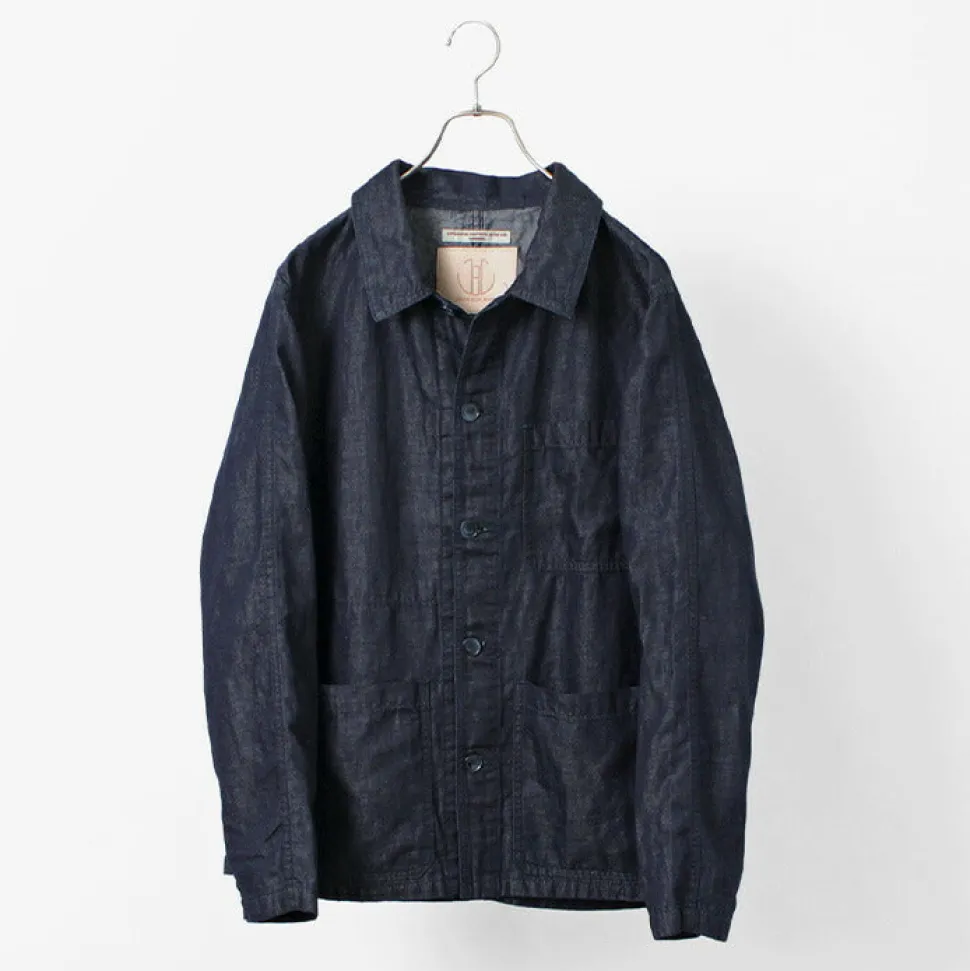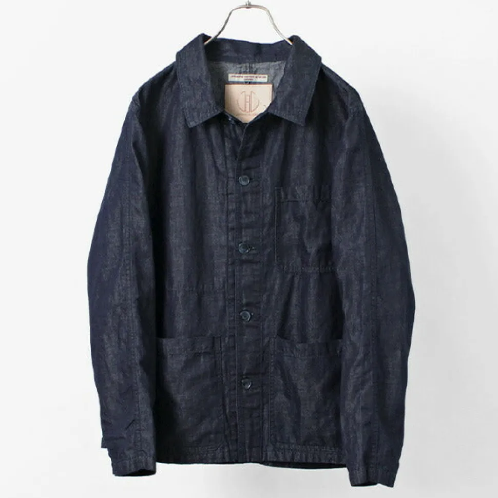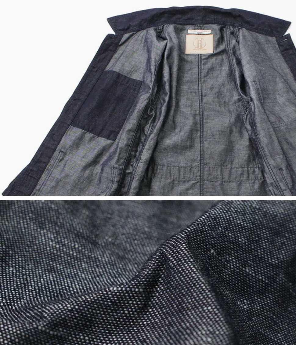 Based on a French work jacket, this piece is made of cotton linen denim fabric.