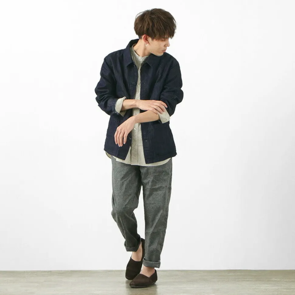 Based on a French work jacket, this piece is made of cotton linen denim fabric. The supple and resilient texture and the elegant look and feel come from the glossy expression.